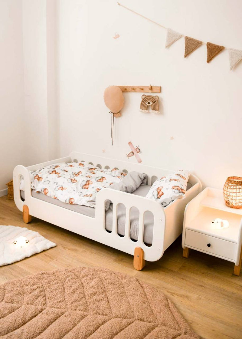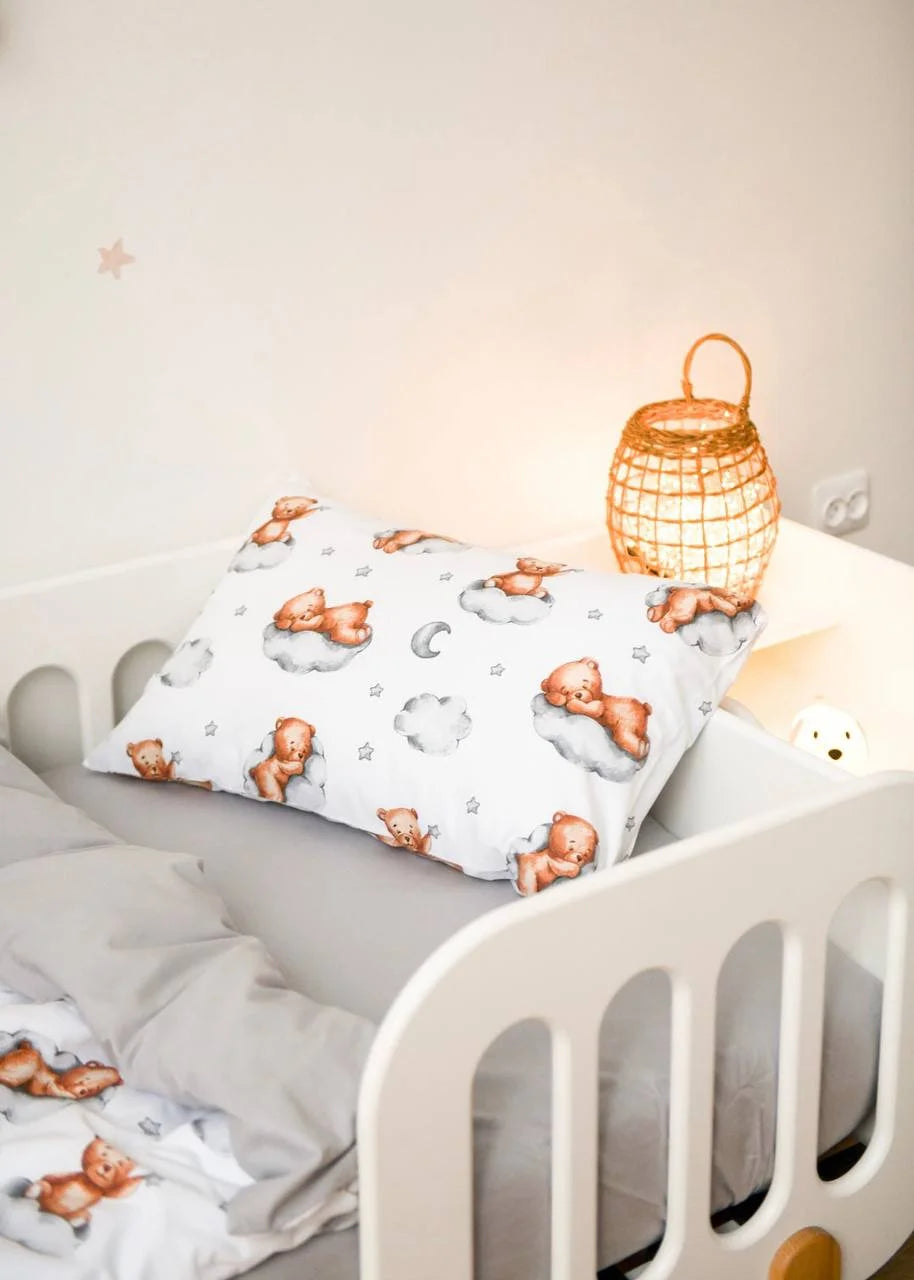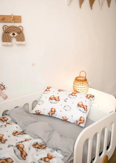 The Bear On Cloud Grey Print Crib Bedding Set offers a high-quality feel and a serene, celestial design. This collection artfully coordinates a whimsical pattern of sleepy bears resting on fluffy clouds and stars with a soft, calming light grey solid fabric. Crafted entirely from premium Poplin (100% Cotton), both the patterned and solid sections provide maximum breathability and a gentle, skin-friendly touch for your baby’s delicate rest. Known for its smooth matte finish and exceptional longevity, this natural poplin material is designed to maintain its signature comfort and soothing grey tones even after more than 300 laundry cycles. The quiet illustrations and modern neutral palette create a serene, cozy, and inviting sleeping environment for your little dreamer.
