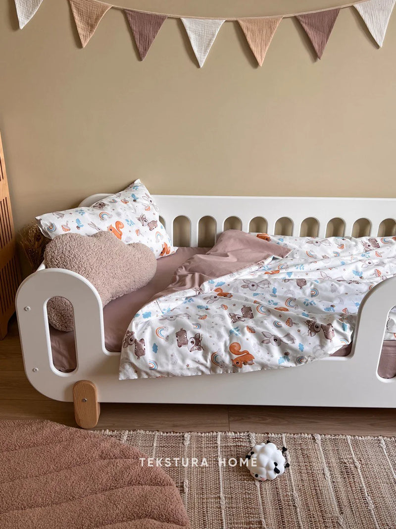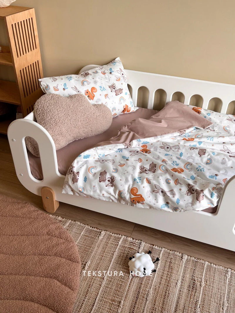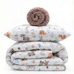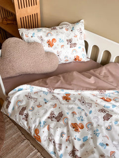 The Squirrel Print Crib Bedding Set offers a luxurious feel and a charming, nature-inspired design. The set cleverly combines premium Satin (for the printed part) and Poplin/Ranforce (for the solid part) in a lovely Grey-Lilac color. Satin is a natural, soft, and durable fabric known for its smooth feel and slight glossy finish, maintaining its quality even after 300+ washes. The gentle squirrel print and soft color palette create a quiet, comfortable, and inviting sleeping environment for your baby.