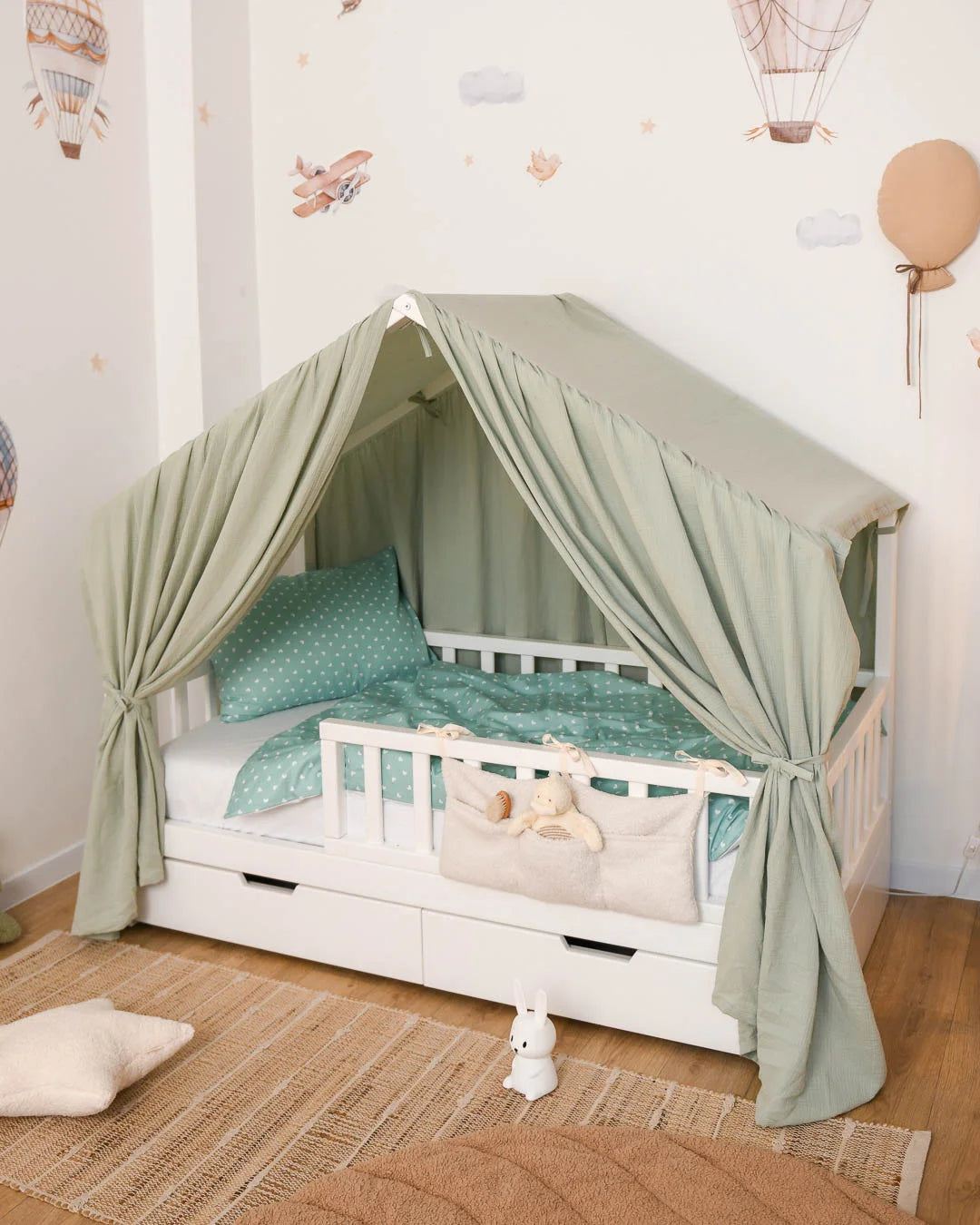 The Green Hearts Print Crib Bedding Set offers a high-quality feel and a classic, charming design. This collection elegantly pairs premium Satin (100% Сotton), featuring a whimsical white heart print on a soothing green background, with high-quality Poplin (100% Сotton) in a sophisticated grey shade. Satin is a natural, silky-soft fabric known for its smooth finish and subtle sheen, while Poplin provides a lightweight, breathable feel with a soft, matte texture. Both materials are 100% natural and exceptionally durable, ensuring they maintain their premium quality and gentle colors even after more than 300+ laundry cycles. The refreshing green palette and modern grey accents create a serene, cozy, and inviting sleeping environment for your little one.