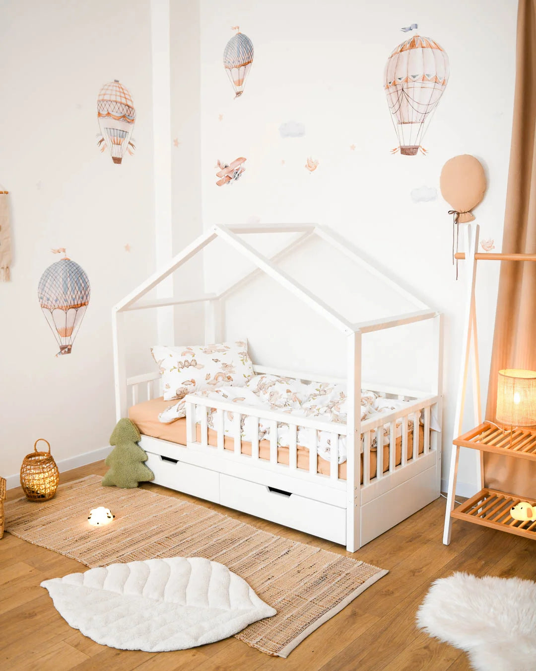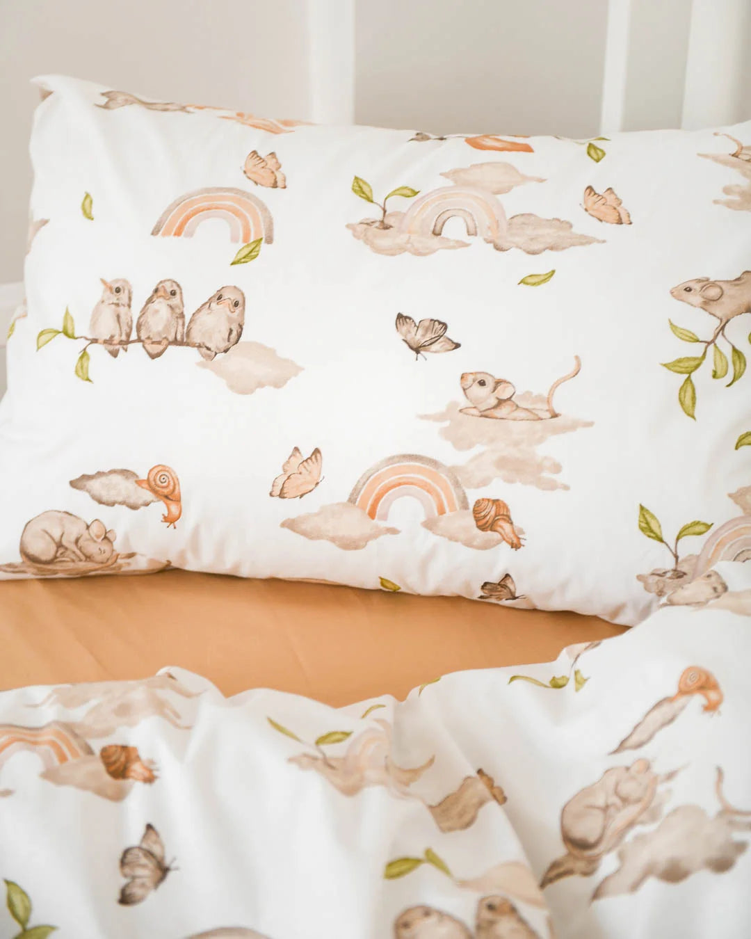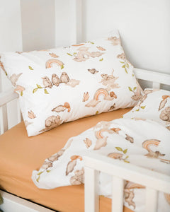 The Mouse Print Poplin Crib Bedding Set offers a high-quality feel and a charming, whimsical design. This collection beautifully coordinates a playful print featuring tiny field mice, rainbows, and forest friends with a warm, rich caramel solid fabric. Crafted entirely from premium Poplin (100% Cotton), both the patterned and solid sections ensure maximum breathability and a skin-friendly touch for your baby’s delicate sleep. Poplin is a natural, robust material celebrated for its soft, matte texture and exceptional wear resistance, maintaining its signature comfort and vibrant tones even after 300+ washes. The delightful illustrations and soothing caramel palette create a serene, joyful, and perfectly comfortable environment for your little one's dreams.