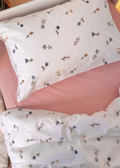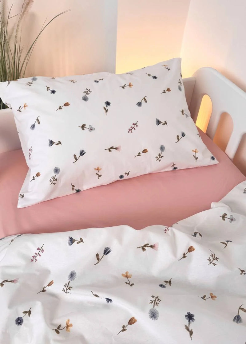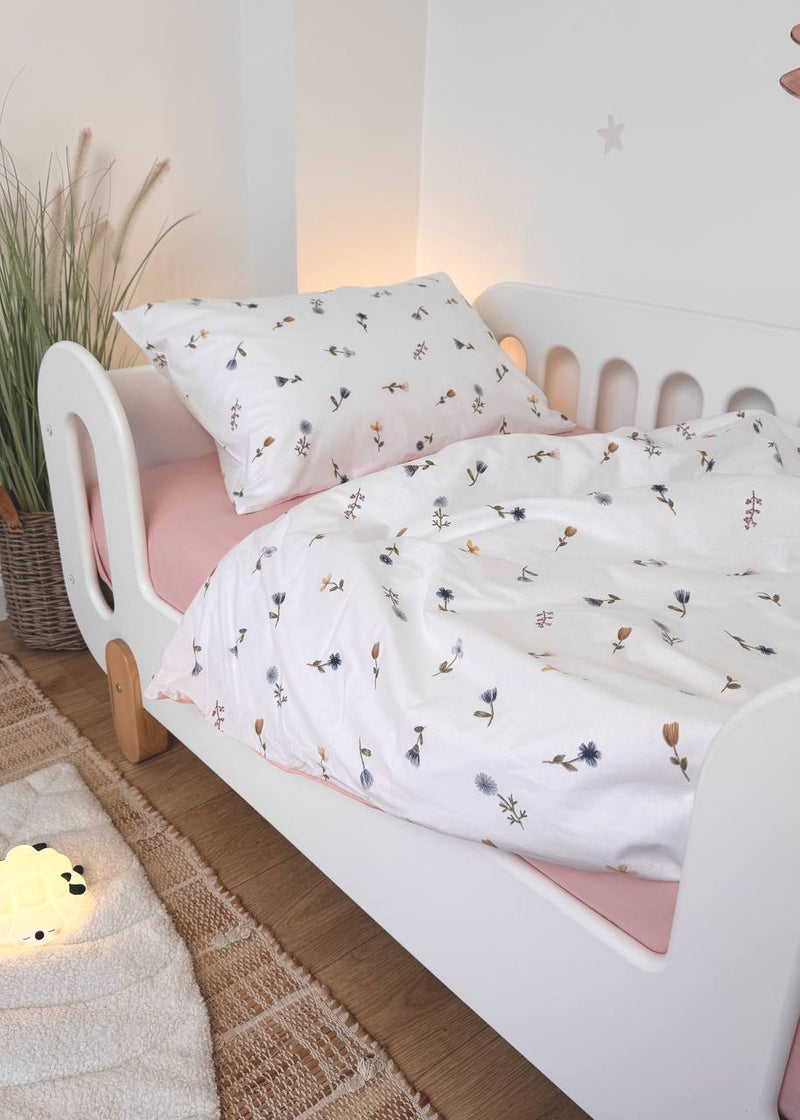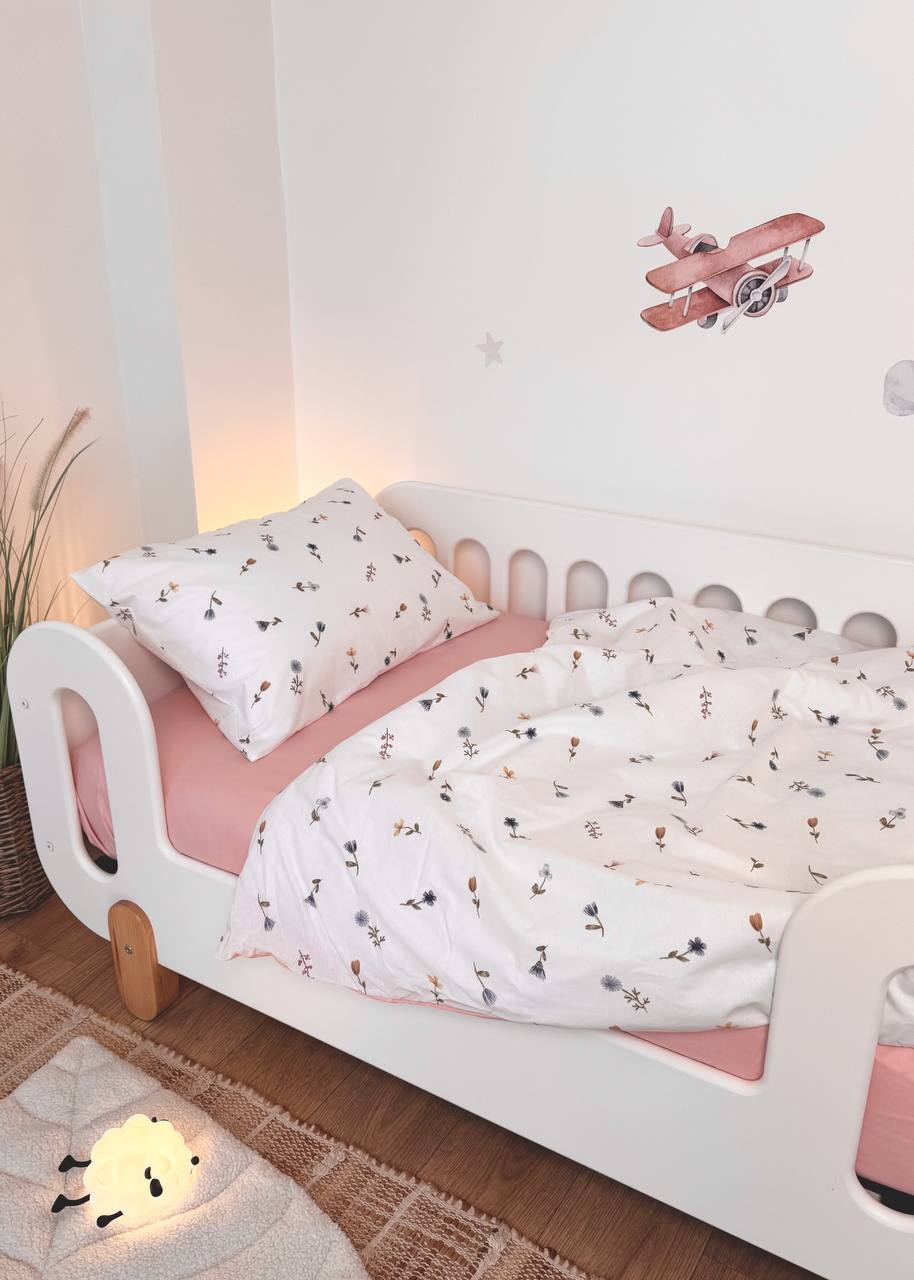 The Floral Symphony Pink Print Crib Bedding Set offers a high-quality feel and a beautifully elegant, botanical design. This set artfully coordinates a whimsical wildflower print with a soft, soothing powder pink solid fabric. Crafted entirely from premium Poplin (100% Cotton), both the patterned and solid pieces ensure maximum breathability and a skin-friendly touch for your baby’s delicate skin. Poplin is a natural, durable material known for its soft, matte texture and exceptional longevity, maintaining its comfort and gentle tones even after more than 300 washes. The harmonious floral motifs and tender pink palette create a quiet, comfortable, and inviting sleeping environment for your little one.