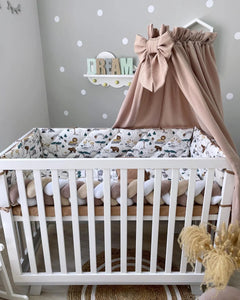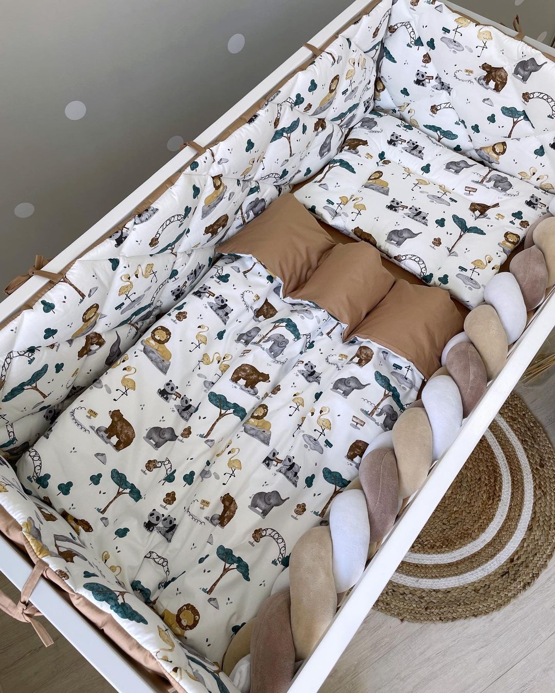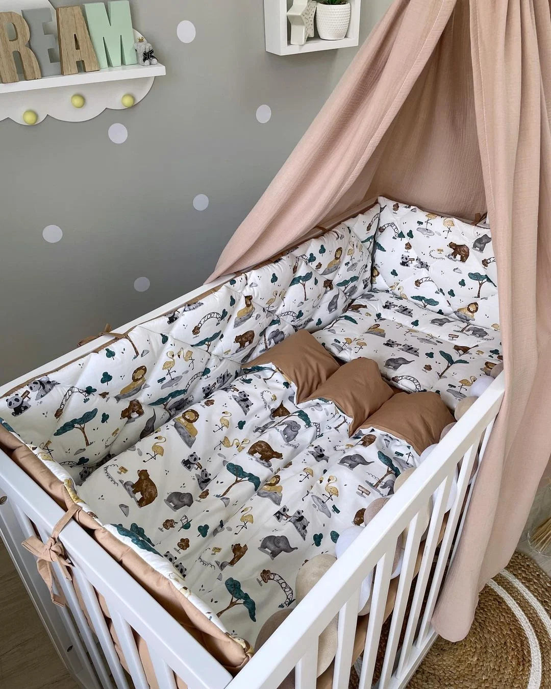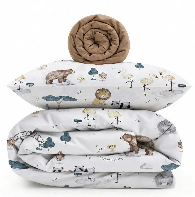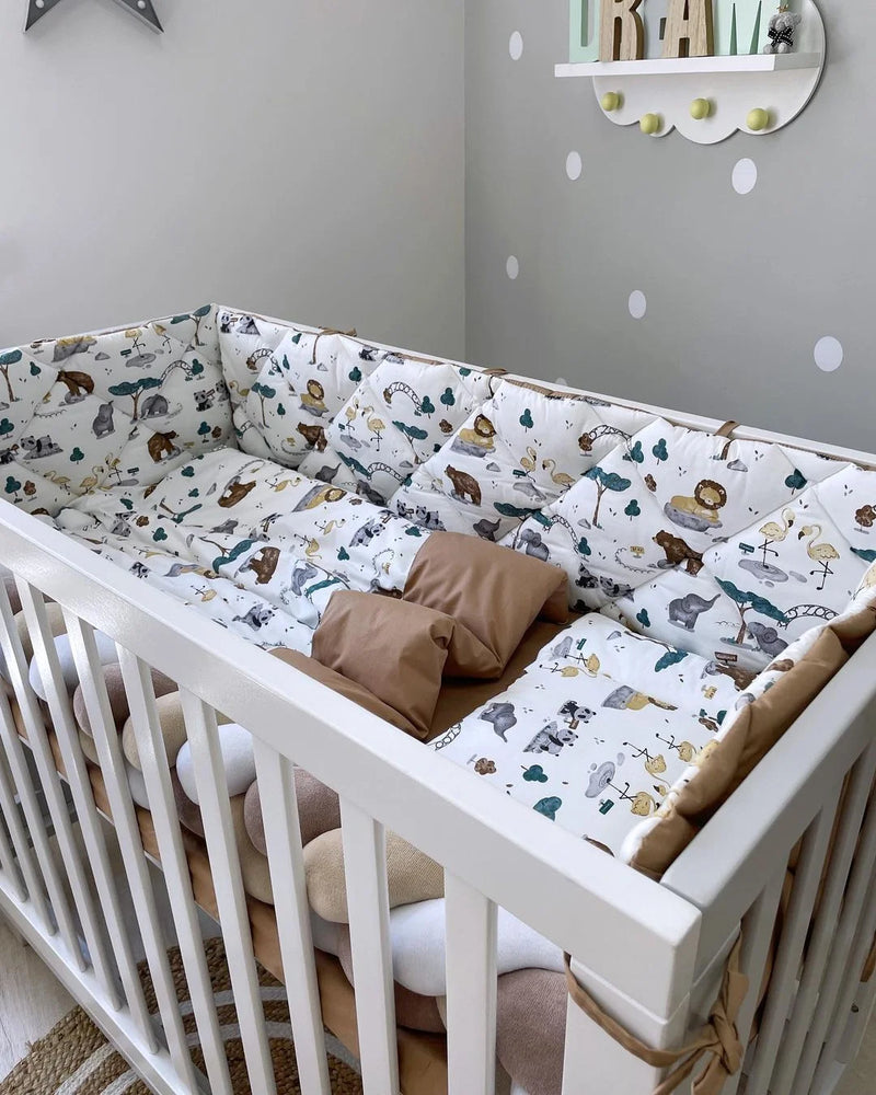 The Zoo Print Crib Bedding Set offers a high-quality feel and a charming, educational design. This collection elegantly pairs premium Satin (100% Сotton), featuring a detailed "Zoo" print with lions, pandas, flamingos, and bears, with high-quality Poplin (100% Сotton) in a sophisticated "coffee with milk" shade. Satin is a natural, silky-soft fabric known for its smooth finish and subtle sheen, while Poplin provides a lightweight, breathable feel with a soft, matte texture. Both are 100% natural, exceptionally durable materials that maintain their premium quality and warm neutral tones even after more than 300 laundry cycles. The playful animal illustrations and earthy palette create a joyful, comfortable, and inviting sleeping environment for your little explorer.