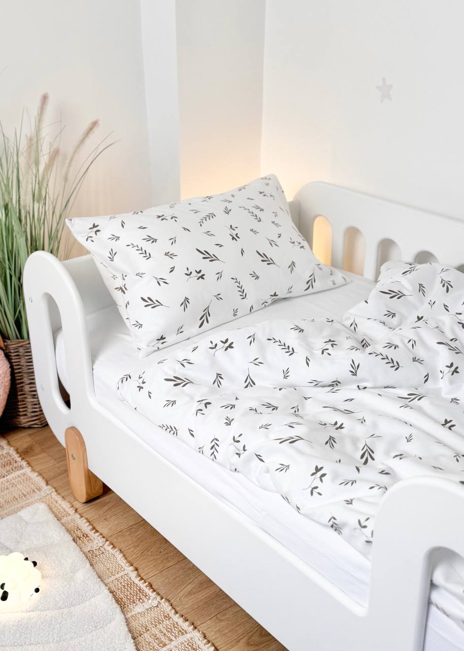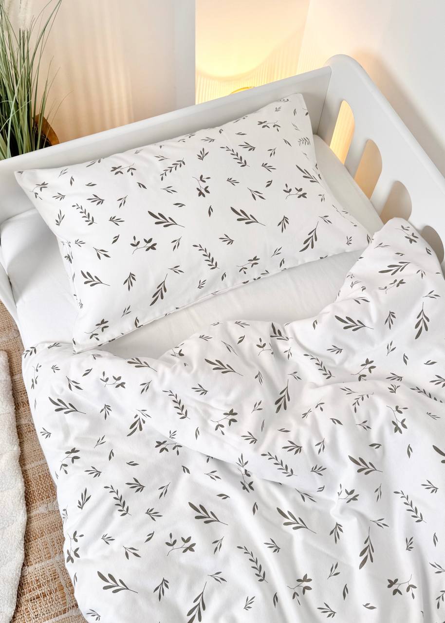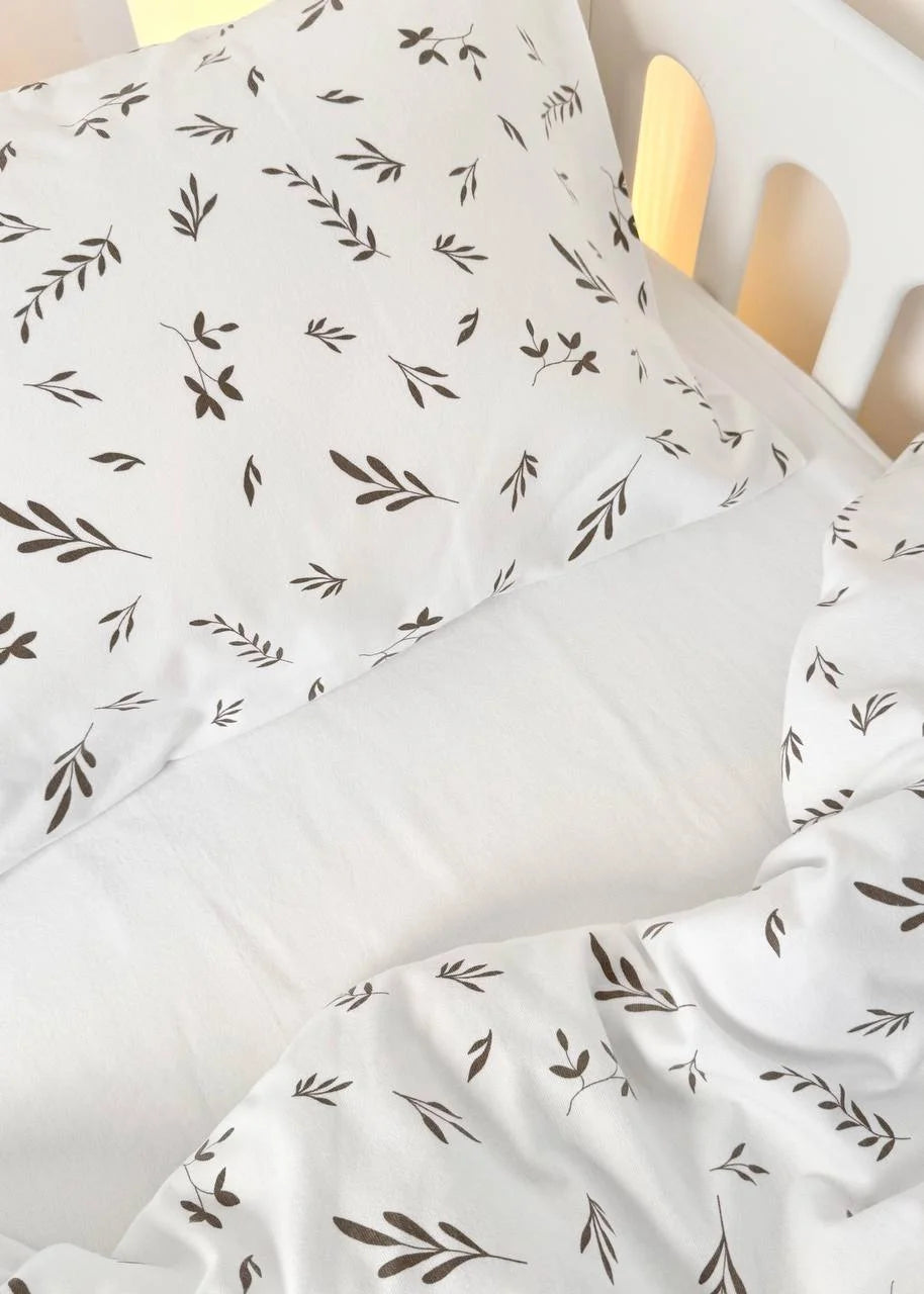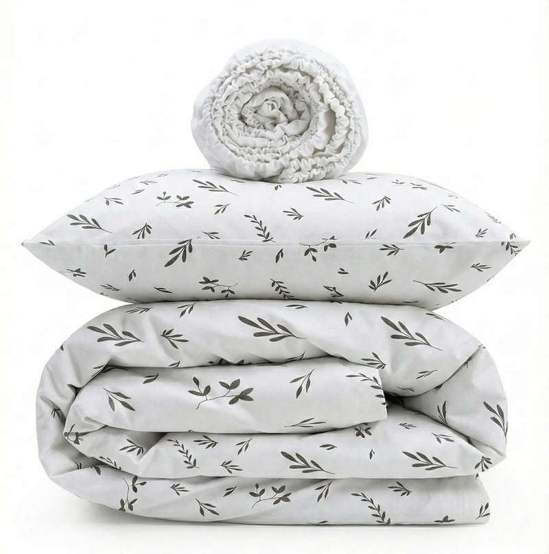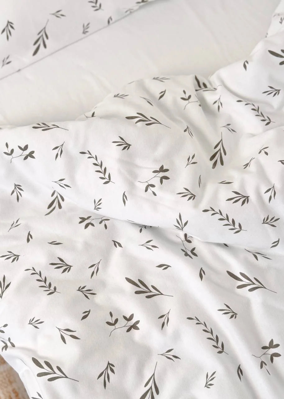 The Soft Leaf Print Crib Bedding Set offers a superior snuggly feel and a timeless, nature-inspired design. Crafted from premium 100% Cotton Flannel, this set is specifically designed to provide extra comfort and warmth. Flannel is a natural, brushed fabric known for its incredibly soft, fuzzy texture and excellent heat retention, making it an ideal choice for cooler nights while remaining breathable. The delicate beige-grey leaf print on a clean white base creates a serene, inviting, and quiet sleeping environment for your little one.