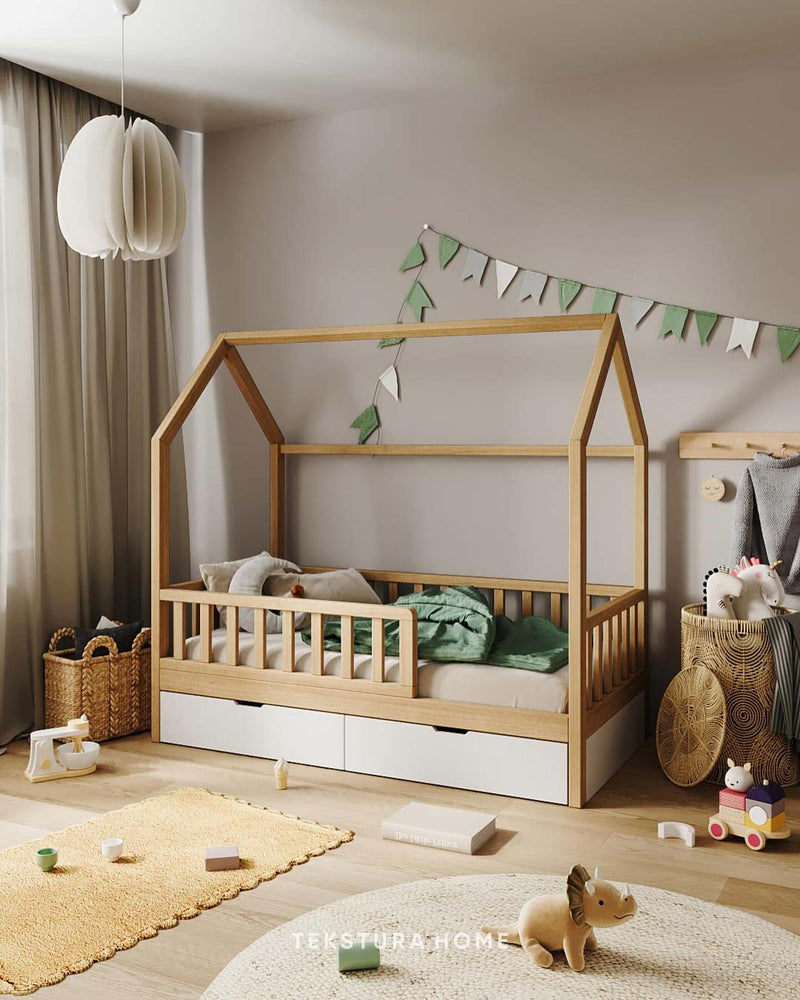 The Hatynka bed is a playful and functional Montessori-inspired house bed designed to encourage a child’s independence, creativity, and confidence. Its cozy house-shaped frame creates a safe and inspiring sleep environment, while the natural beauty of solid wood adds warmth to any kids’ room.