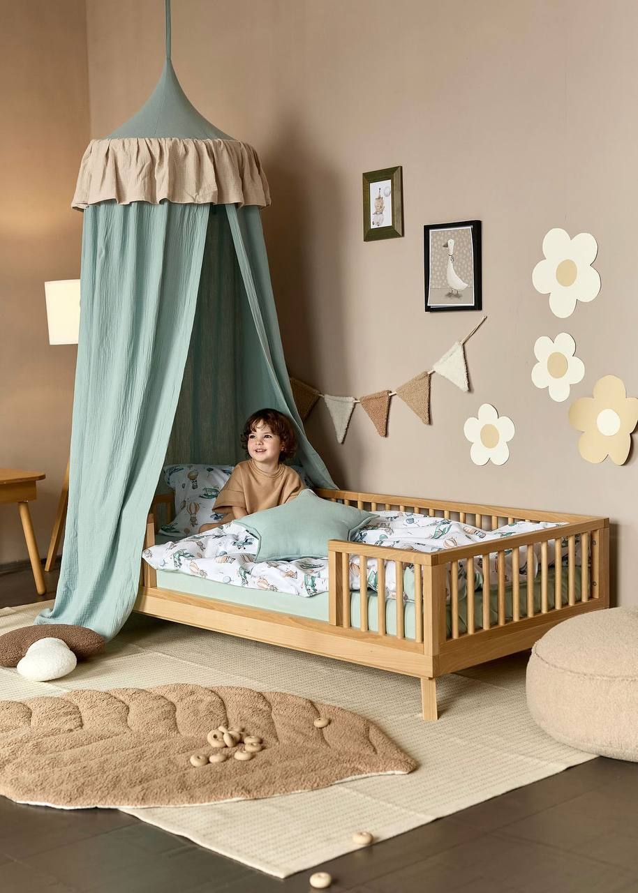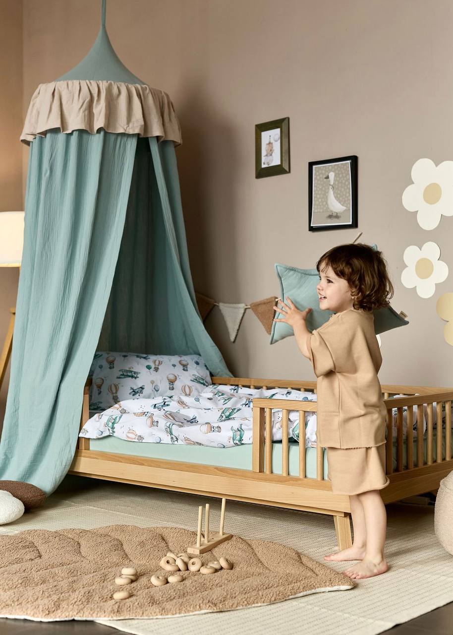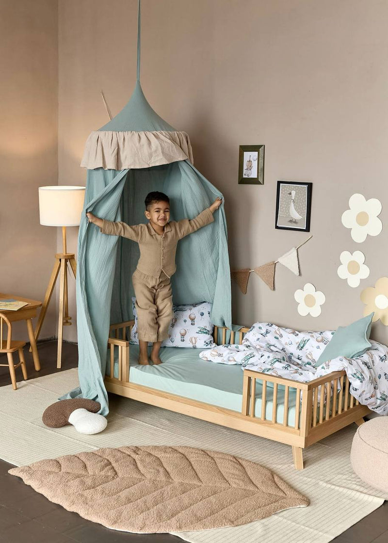 This exquisite Muslin Ruffle Hanging Canopy is designed to create a tranquil retreat over your child's crib or play mat. Crafted from the highly sought-after, breathable muslin (100% organic cotton), the canopy is both soft and airy. The subtle ruffle detail around the top adds a touch of classic elegance and charm. The beautiful Sage color offers a calming, nature-inspired palette, perfect for modern, gender-neutral, and Boho nursery designs.