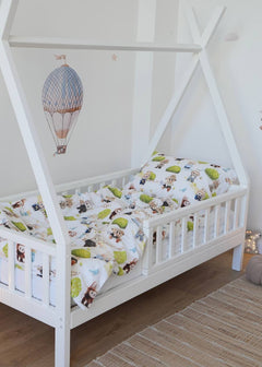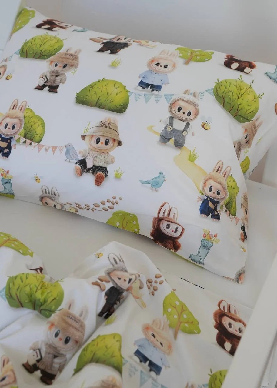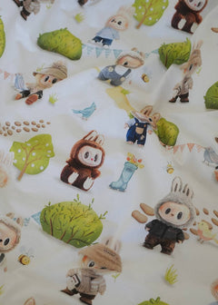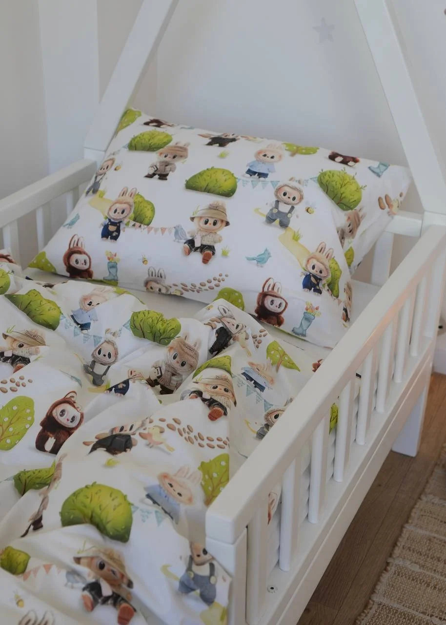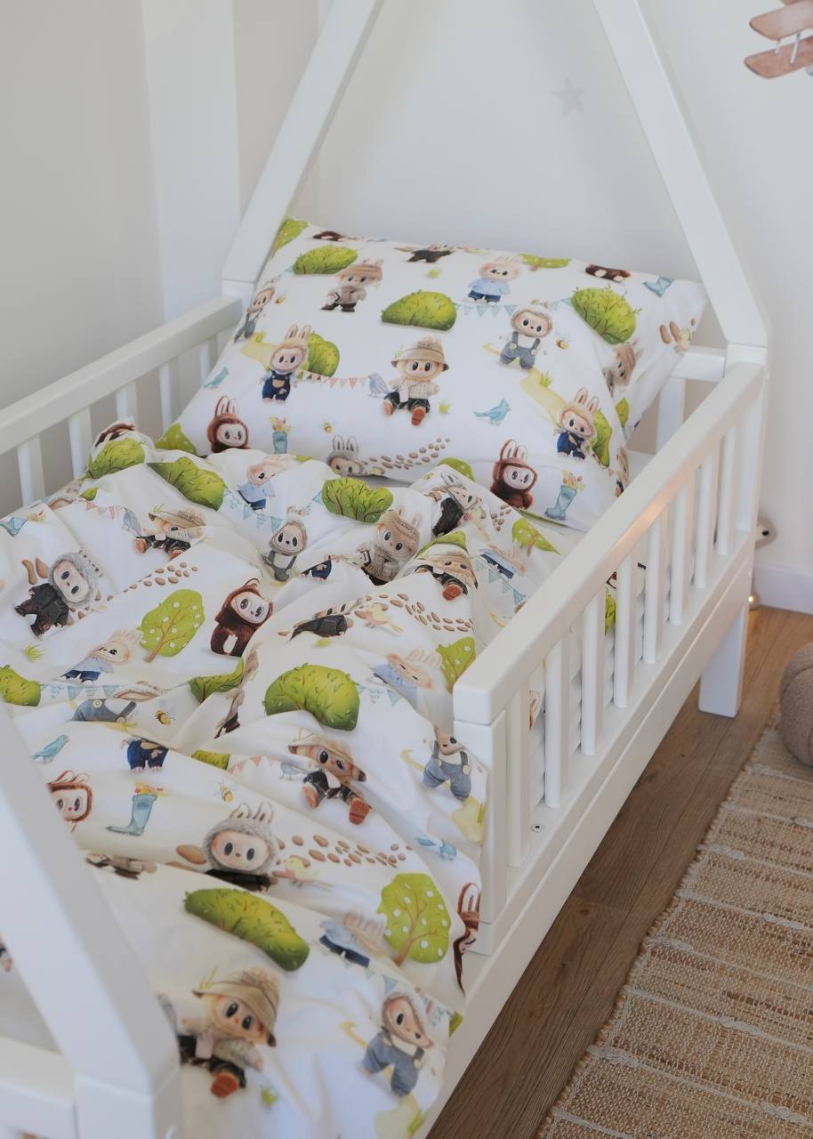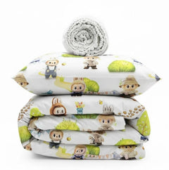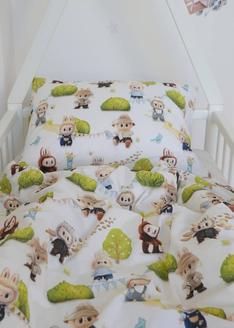 The Labubu Print Crib Bedding Set offers a high-quality feel and a trendy, imaginative design. This set artfully coordinates a whimsical print featuring the popular Labubu characters with a soft, calming light grey solid fabric. Crafted entirely from premium Poplin (100% Cotton), both the patterned and solid sections ensure maximum breathability and a gentle, skin-friendly touch for your baby’s delicate rest. Poplin is a natural, robust material celebrated for its smooth matte texture and remarkable wear resistance, ensuring the fabric maintains its signature softness and soothing grey tones even after more than 300 laundry cycles. The delightful illustrations and modern neutral palette create a joyful, comfortable, and perfectly stylish environment for your little one’s nursery.