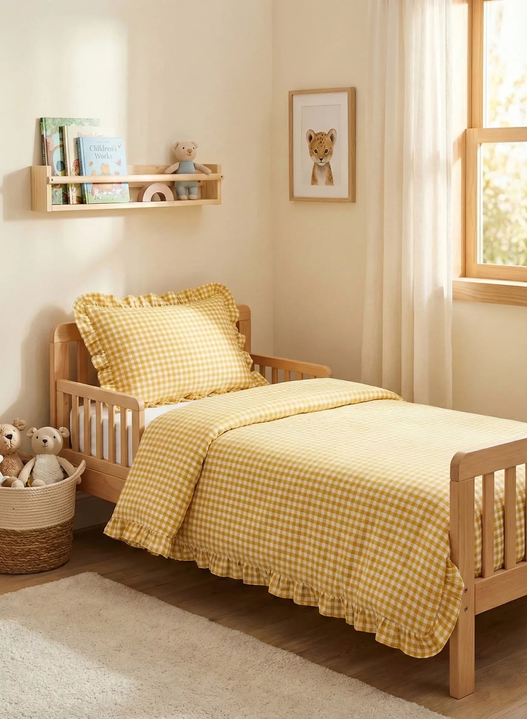 The Yellow Squares Washed Cotton Plaid Crib Bedding Set offers a superior cozy feel and a bright, timeless design. Crafted from premium 100% Washed Cotton, this set features an exceptionally soft, "lived-in" texture that is incredibly kind to your baby's delicate skin. Washed Cotton is a natural, breathable material prized for its relaxed look and durability; it is highly absorbent and conveniently becomes even softer with every laundry cycle, requiring no ironing to maintain its charm. The cheerful yellow plaid pattern and warm tones create a sunny, comfortable, and inviting sleeping environment for your little one.