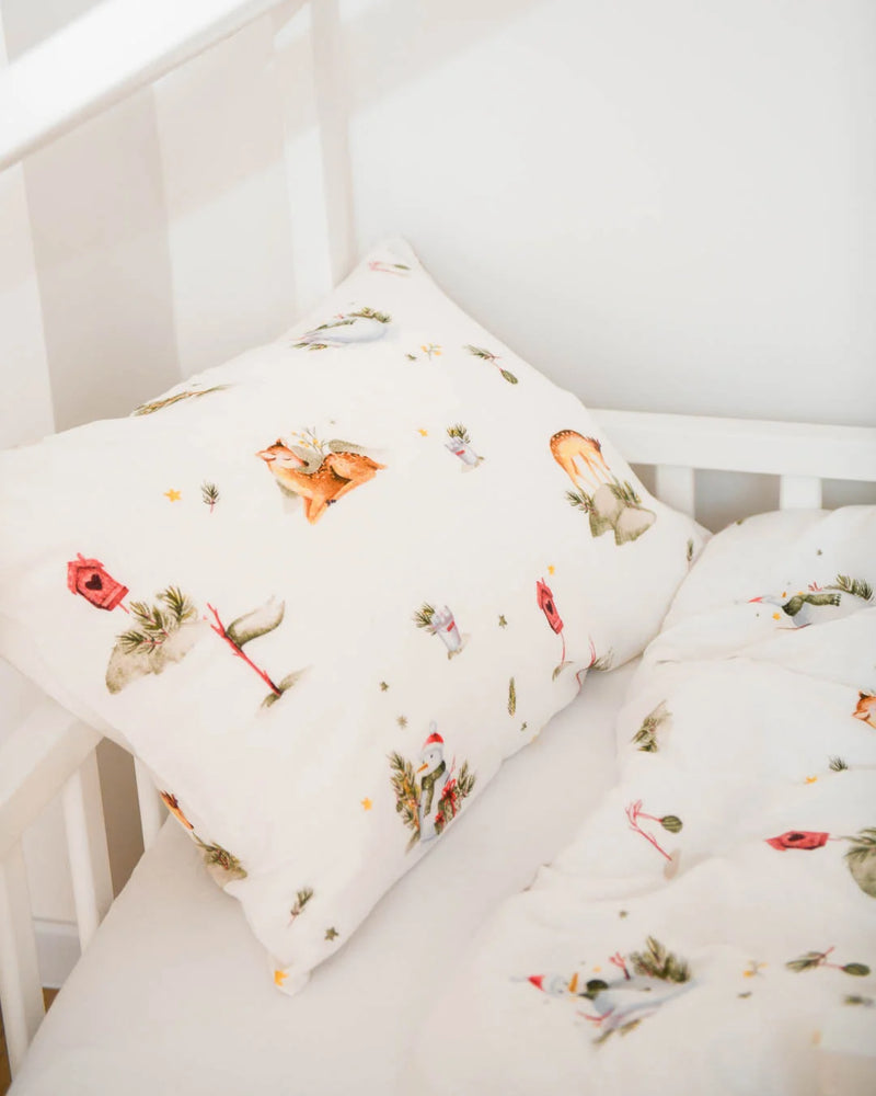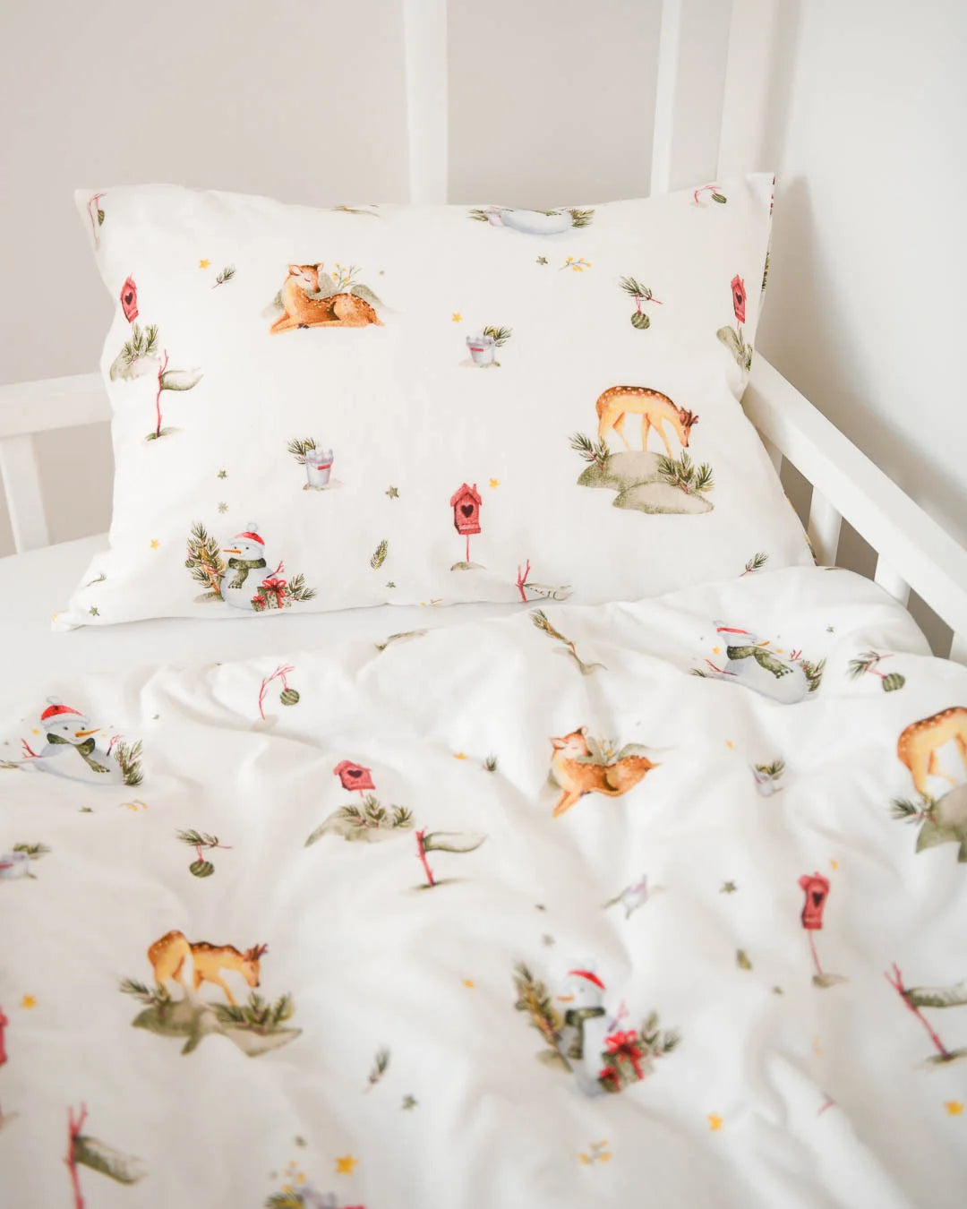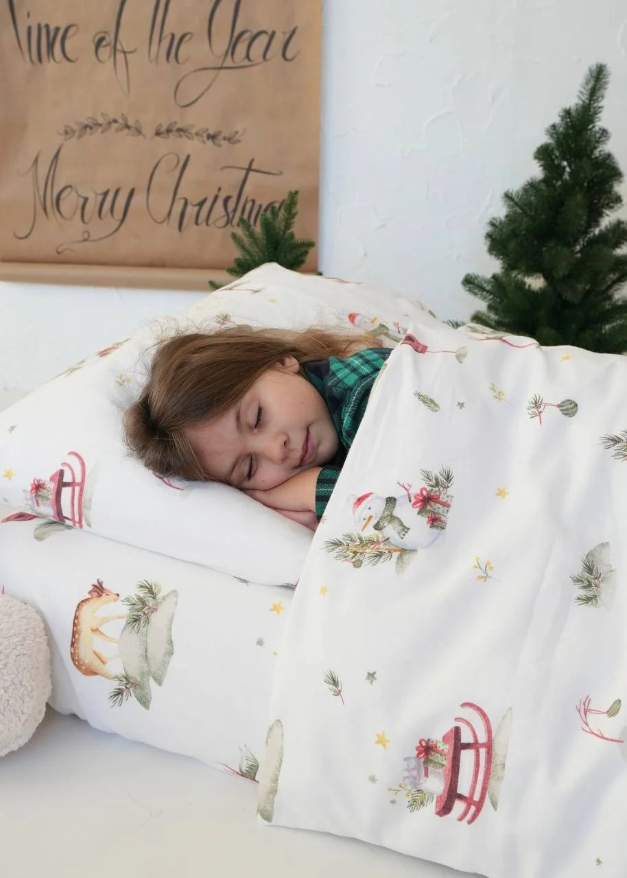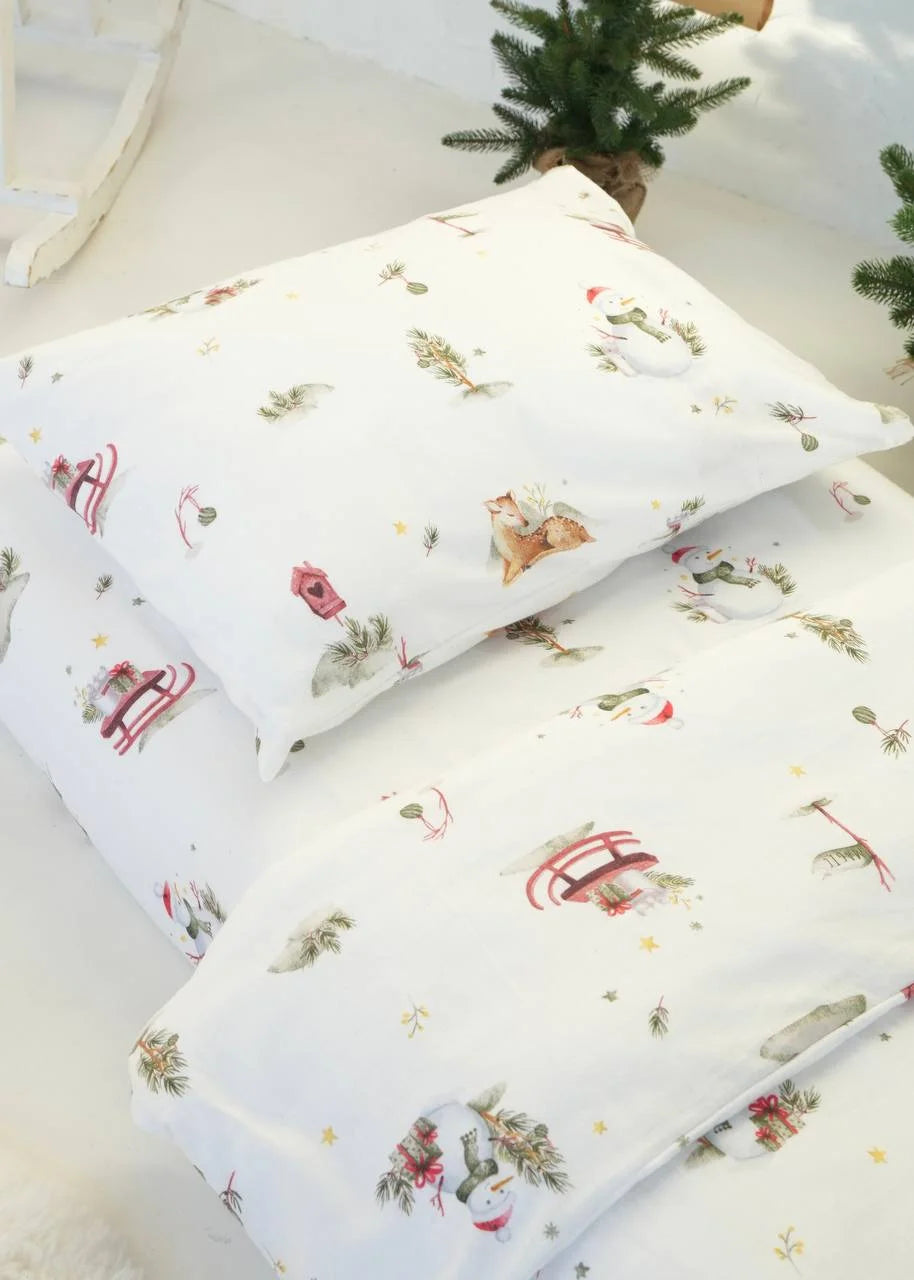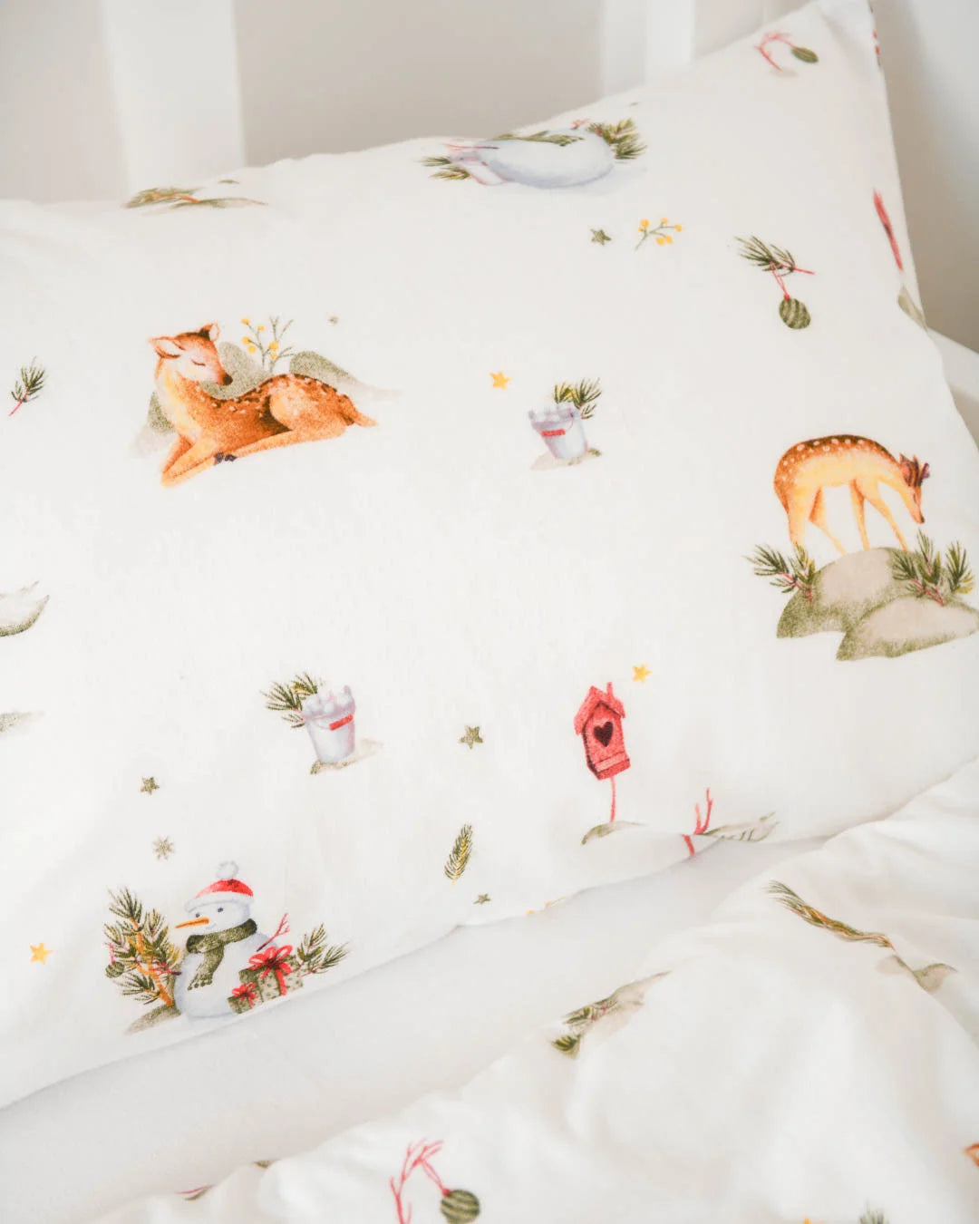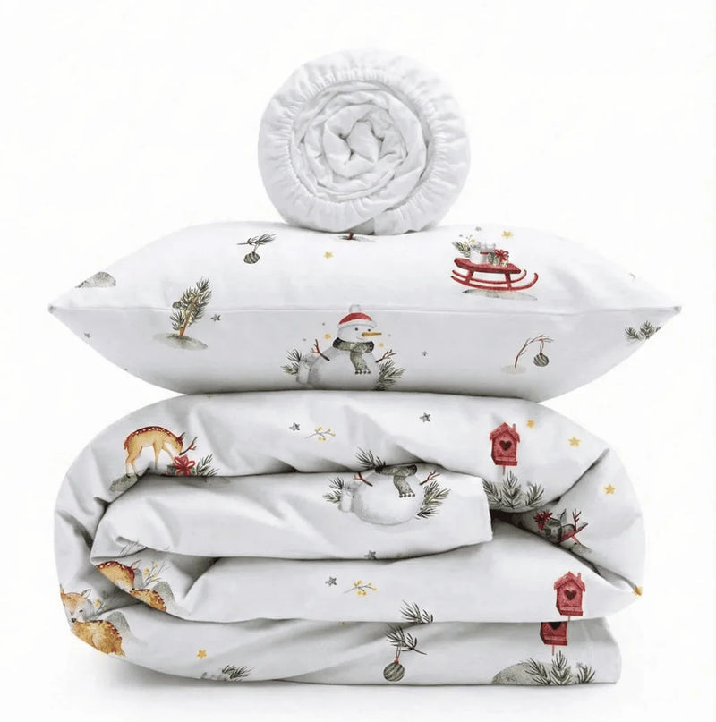 The Let It Snow Print Crib Bedding Set offers a superior cozy feel and an enchanting, winter-themed design. This collection artfully pairs a festive print—featuring cheerful snowmen, woodland deer with bows, sleds, and holiday ornaments—with a crisp, clean white solid fabric. Crafted entirely from premium Flannel (100% Cotton), both the patterned and solid sections provide maximum warmth and an exceptionally soft, brushed texture that is perfect for keeping your baby comfortable during colder nights. Flannel is a natural, breathable material celebrated for its ability to retain heat while remaining gentle and skin-friendly against your baby’s delicate rest. It is remarkably durable, maintaining its plush softness and festive illustrations even after more than 300+ laundry cycles. The delightful holiday motifs and classic white palette create a serene, cozy, and inviting sleeping environment for your little one throughout the winter season.