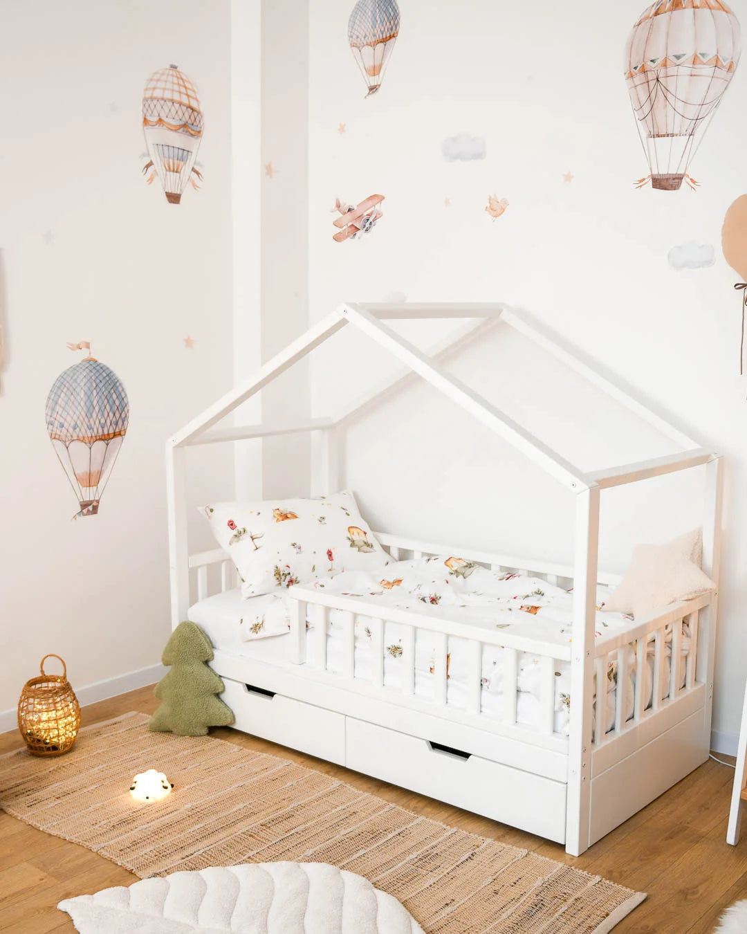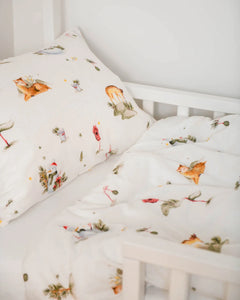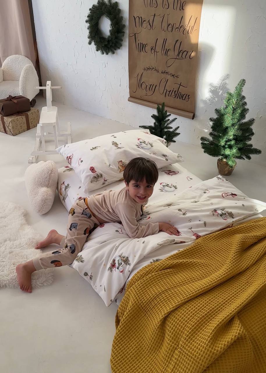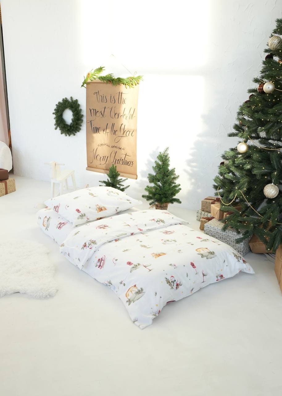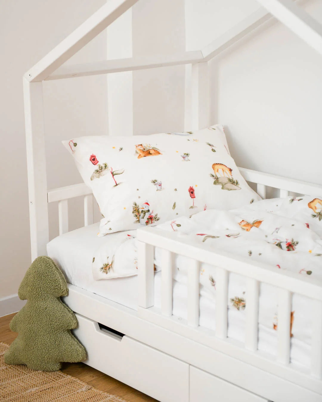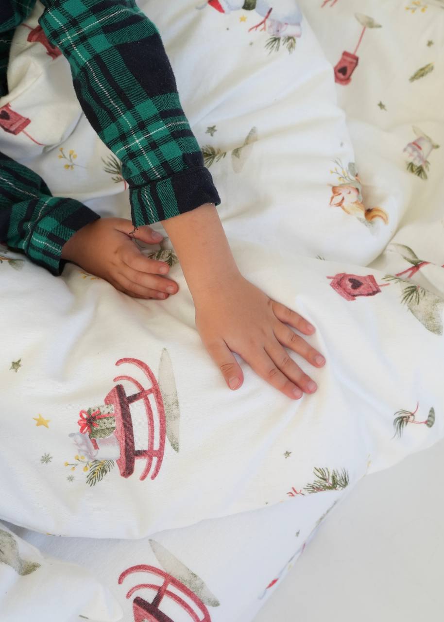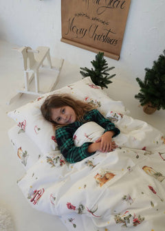 The Let It Snow Print Crib Bedding Set offers a superior cozy feel and an enchanting, winter-themed design. This collection artfully pairs a festive print—featuring cheerful snowmen, woodland deer with bows, sleds, and holiday ornaments—with a crisp, clean white solid fabric. Crafted entirely from premium Flannel (100% Cotton), both the patterned and solid sections provide maximum warmth and an exceptionally soft, brushed texture that is perfect for keeping your baby comfortable during colder nights. Flannel is a natural, breathable material celebrated for its ability to retain heat while remaining gentle and skin-friendly against your baby’s delicate rest. It is remarkably durable, maintaining its plush softness and festive illustrations even after more than 300+ laundry cycles. The delightful holiday motifs and classic white palette create a serene, cozy, and inviting sleeping environment for your little one throughout the winter season.