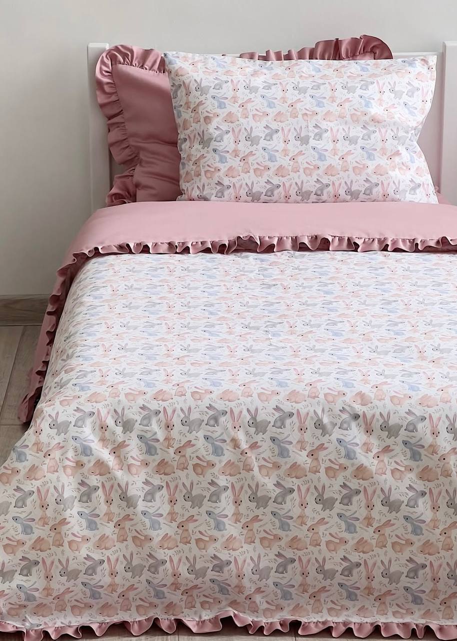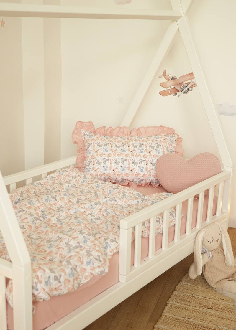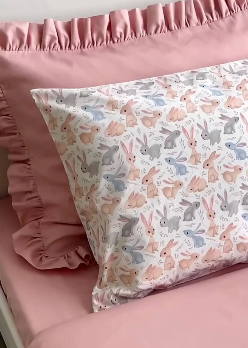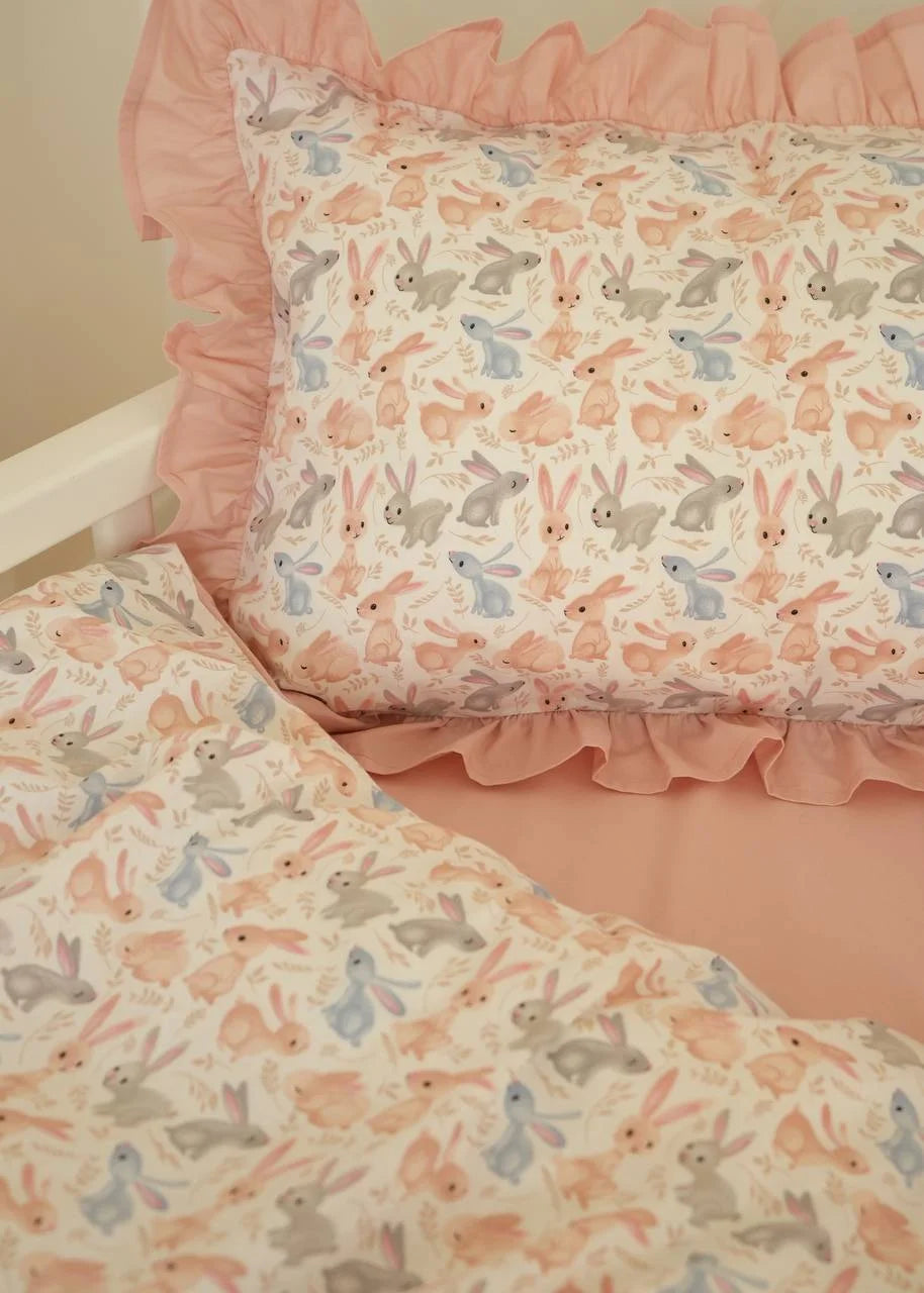 Whimsical hops and powder pink softness for a gentle rest.