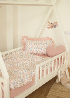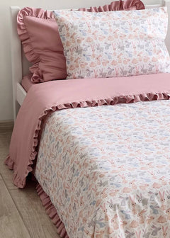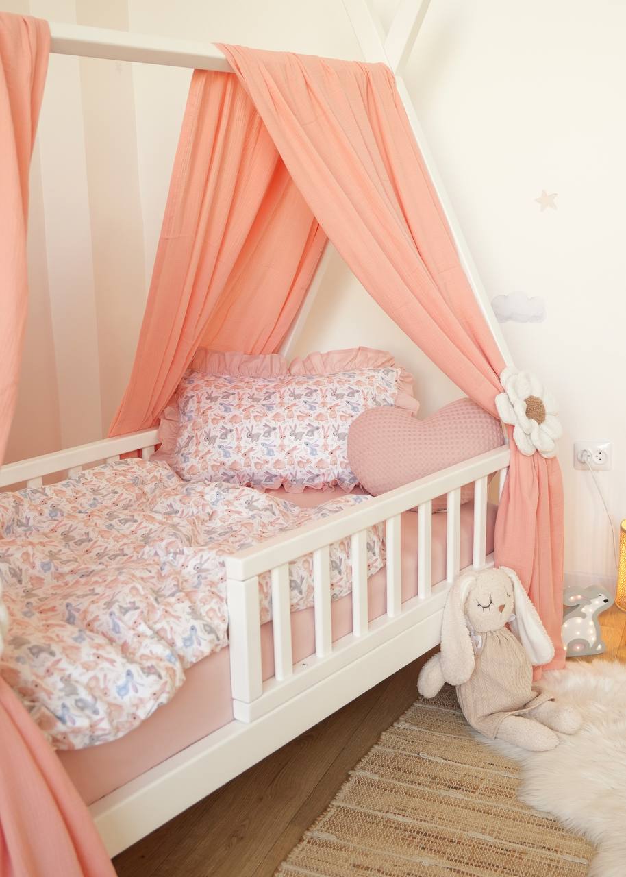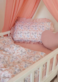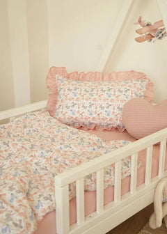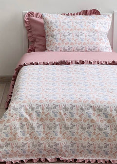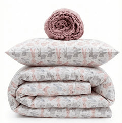 The Sweet Bunnies Print Crib Bedding Set offers a high-quality feel and a charming, delightful design. This set artfully coordinates a playful print featuring delicate bunnies with a soft, soothing powder pink solid fabric. Crafted entirely from premium Poplin (100% Cotton), both the patterned and solid sections ensure maximum breathability and a skin-friendly touch for your baby’s delicate rest. Poplin is a natural, durable material known for its soft, matte texture and excellent wear resistance, maintaining its signature comfort and tender colors even after more than 300 laundry cycles. The endearing rabbit illustrations and peaceful pink palette create a quiet, comfortable, and inviting sleeping environment for your little one.