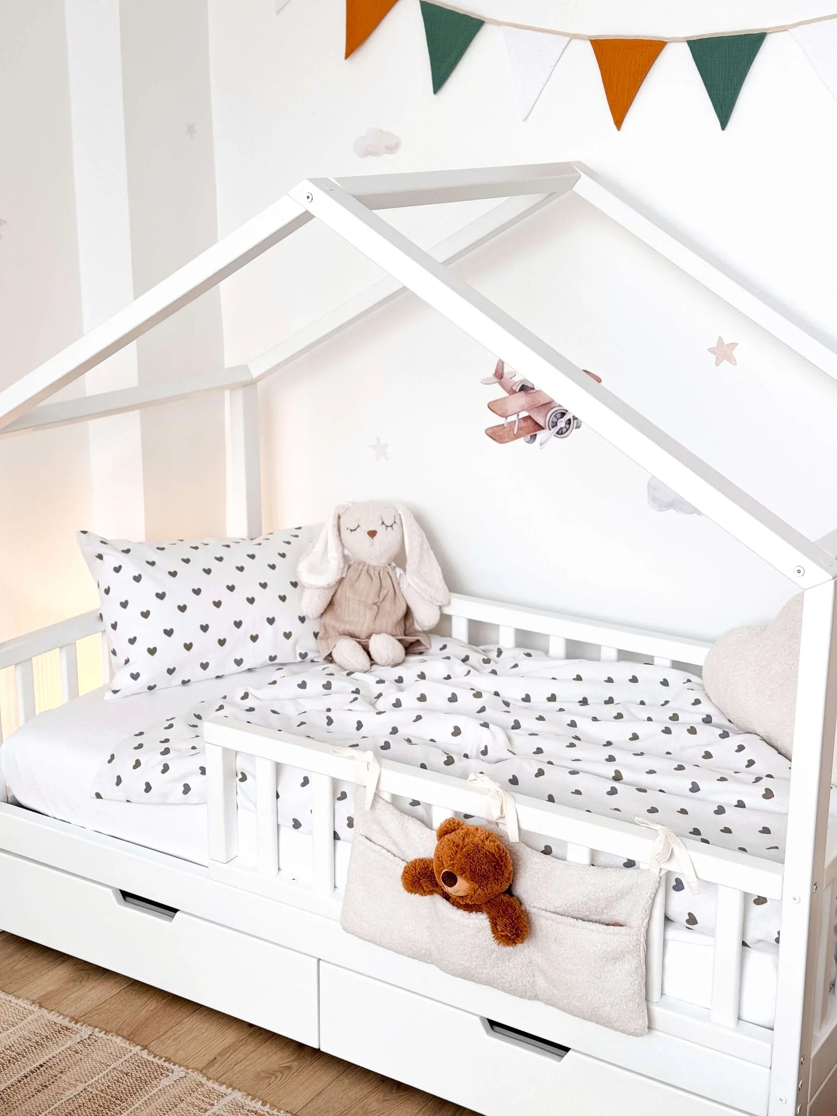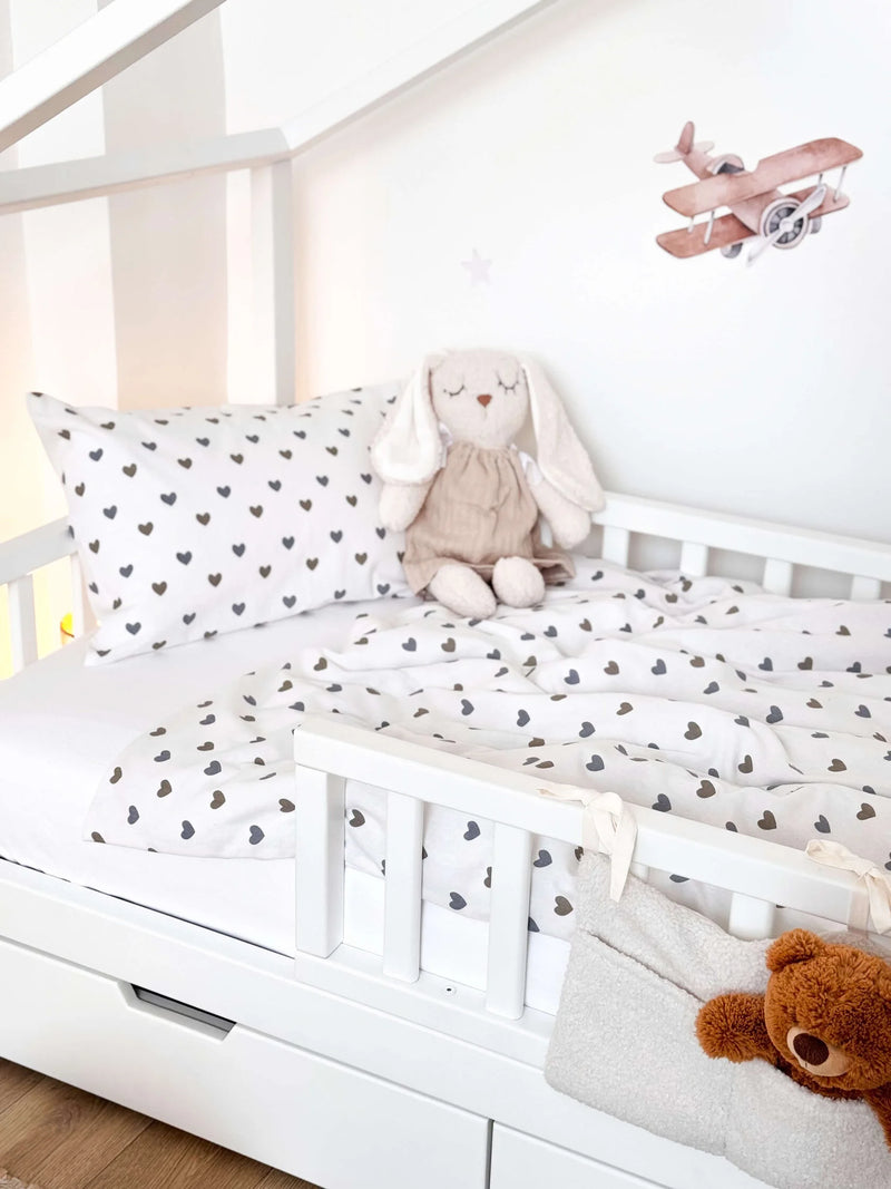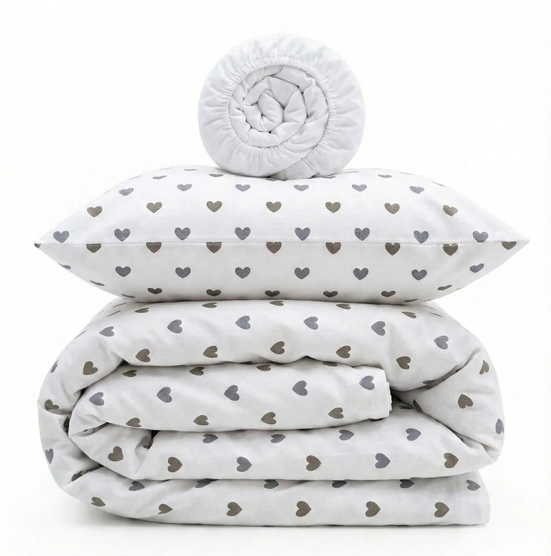 The Soft Hearts Print Crib Bedding Set offers a superior snuggly feel and a delicate, loving design. This set beautifully coordinates a whimsical heart print on a clean white base with a solid white flannel for a pure and classic look. Crafted from premium 100% Cotton Flannel, this collection is specifically designed to provide exceptional comfort and warmth. Flannel is a natural, brushed fabric known for its incredibly soft, velvety texture and excellent heat retention, making it an ideal choice for cooler nights while remaining breathable. The tender heart motifs and minimalist white palette create a serene, cozy, and inviting sleeping environment for your little one.