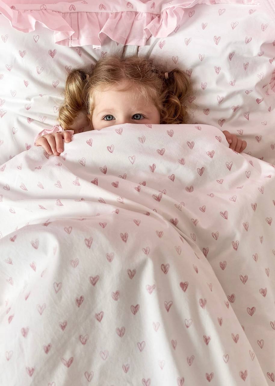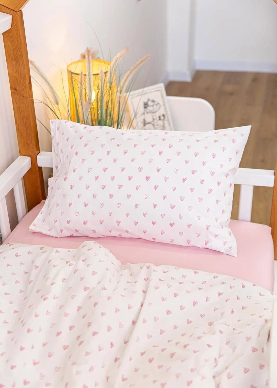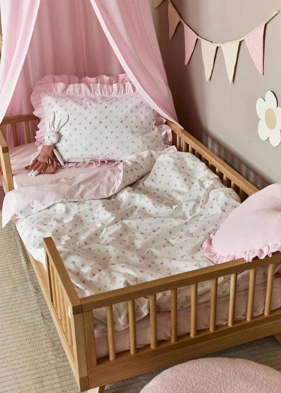 The Pink Hearts Print Crib Bedding Set offers a high-quality feel and a delicate, charming design. This set elegantly pairs premium Satin (100% Сotton) featuring a tiny heart print with high-quality Poplin (100% Сotton) in a soft, soothing light pink shade. Satin is a natural, silky-soft fabric known for its smooth finish and subtle sheen, while Poplin provides a lightweight, breathable feel with a soft, matte texture. Both are exceptionally durable materials that maintain their premium quality and softness even after 300+ washes. The gentle motifs and tender pink palette create a quiet, comfortable, and inviting sleeping environment for your little one.