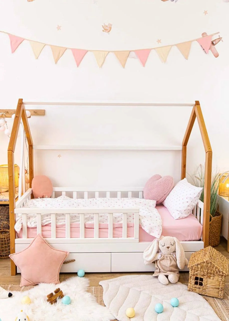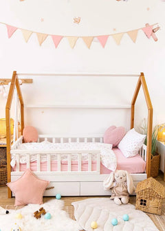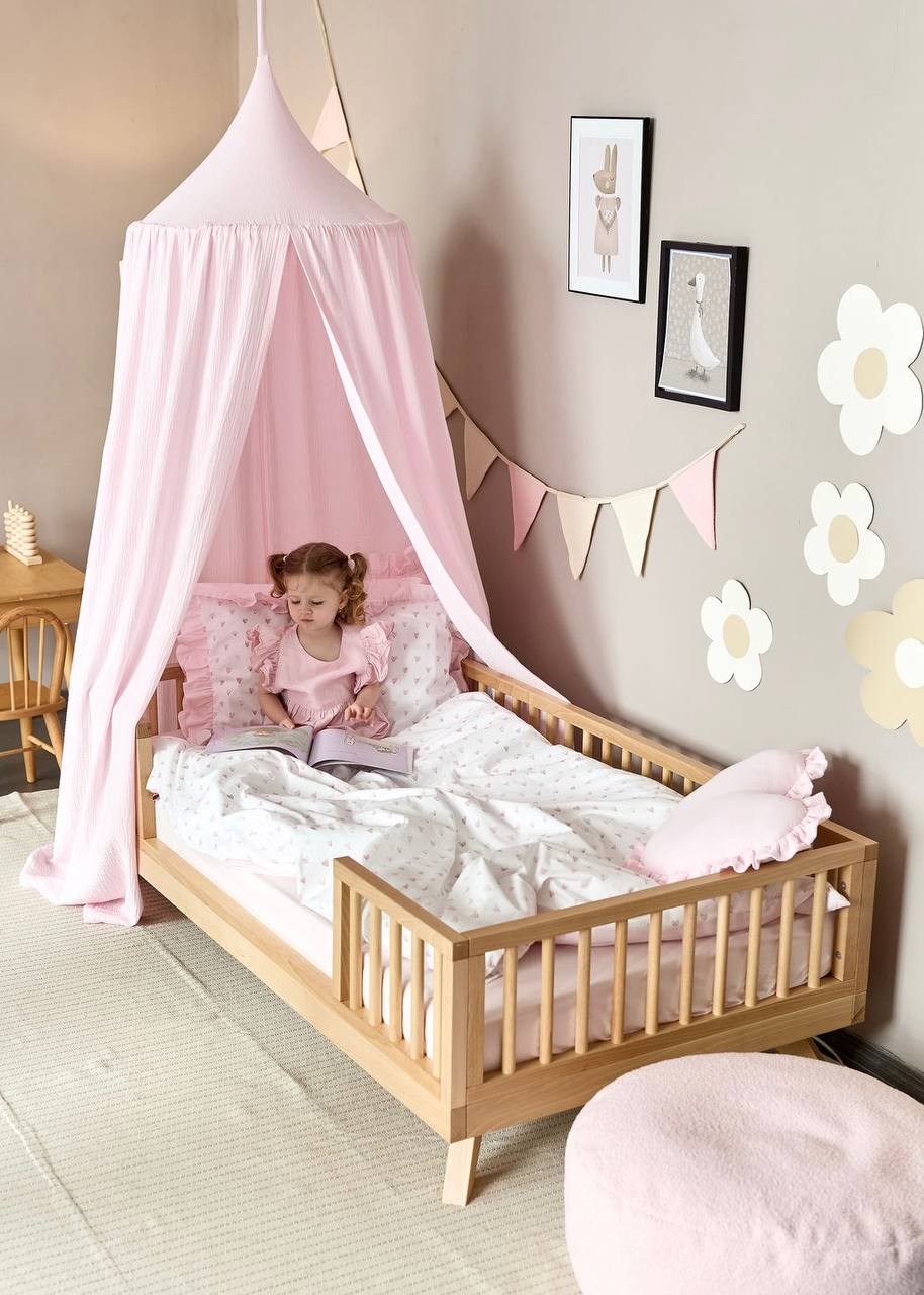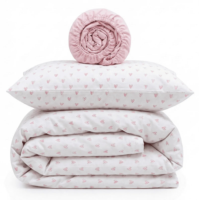 The Pink Hearts Print Crib Bedding Set offers a high-quality feel and a delicate, charming design. This set elegantly pairs premium Satin (100% Сotton) featuring a tiny heart print with high-quality Poplin (100% Сotton) in a soft, soothing light pink shade. Satin is a natural, silky-soft fabric known for its smooth finish and subtle sheen, while Poplin provides a lightweight, breathable feel with a soft, matte texture. Both are exceptionally durable materials that maintain their premium quality and softness even after 300+ washes. The gentle motifs and tender pink palette create a quiet, comfortable, and inviting sleeping environment for your little one.