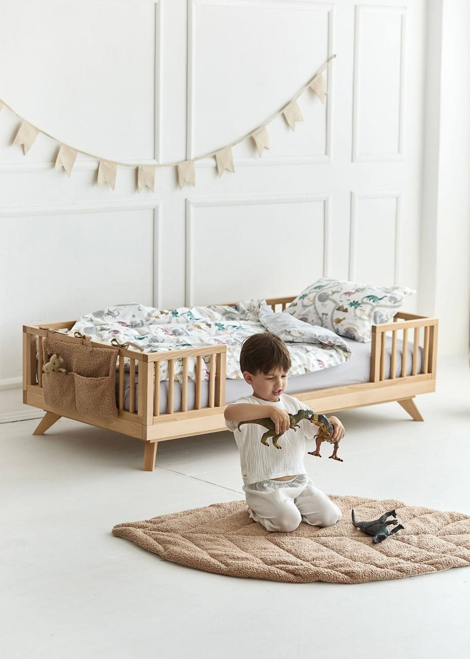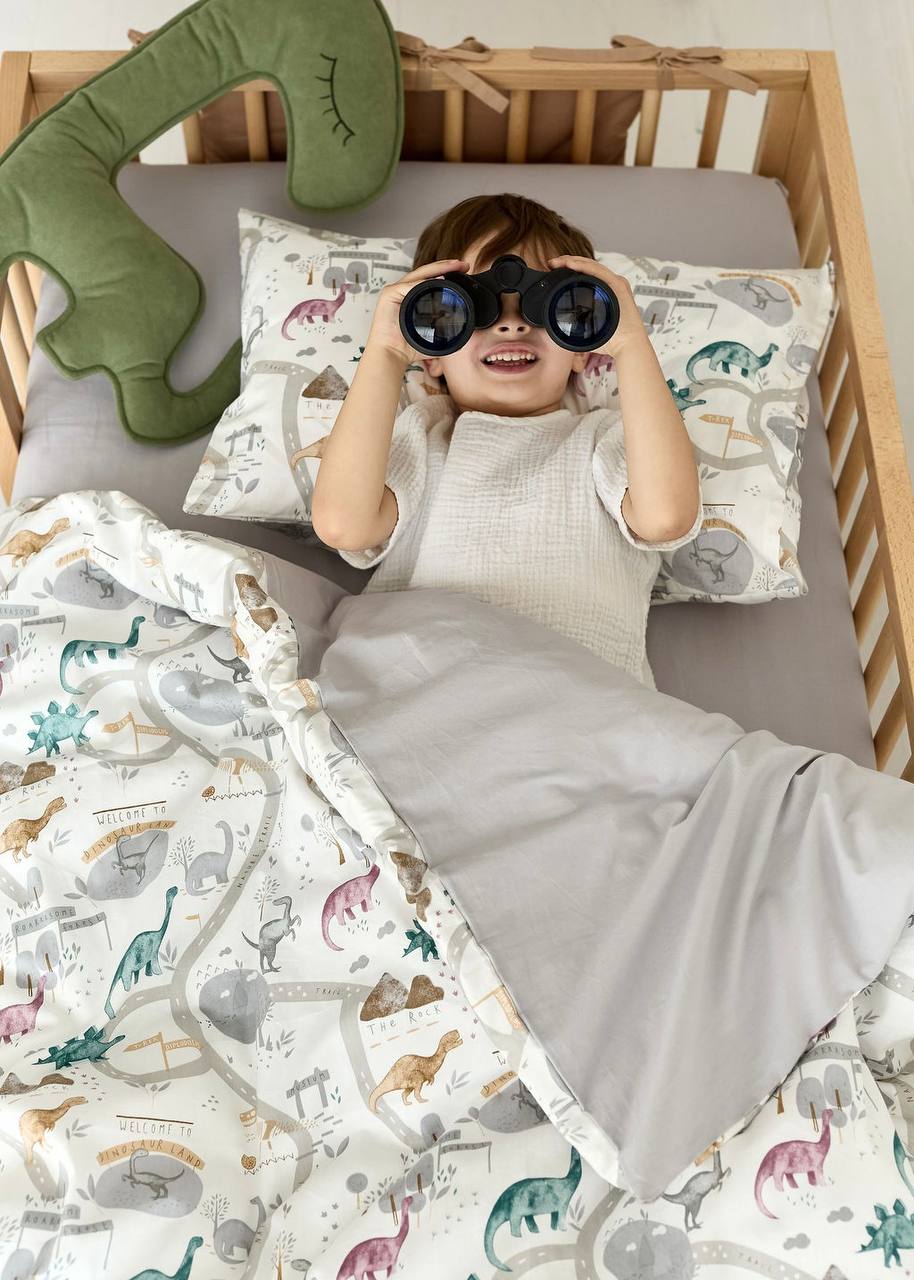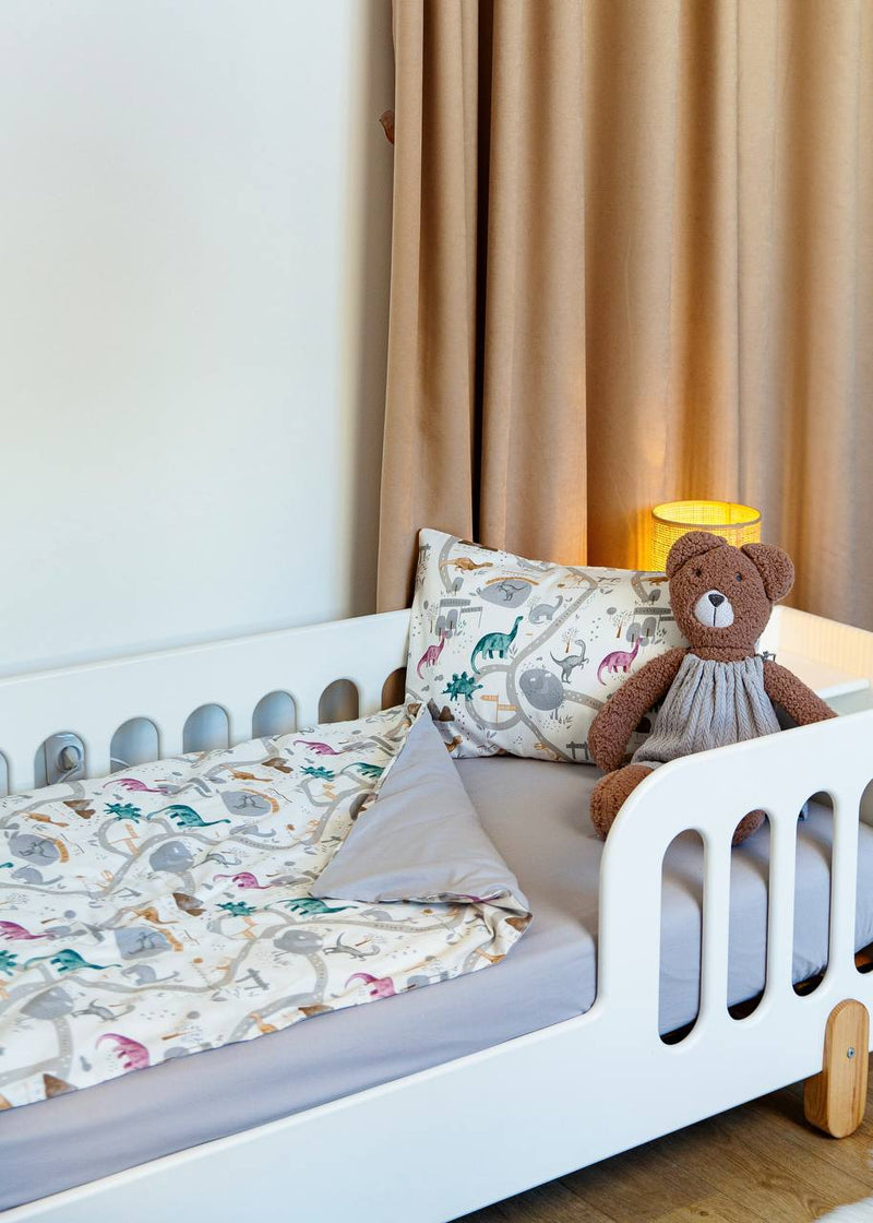 The Dino Print Crib Bedding Set offers a high-quality feel and a playful, adventurous design. This set expertly pairs premium Satin (100% Cotton) featuring a variety of colorful dinosaurs with high-quality Poplin (100% Cotton) in a classic, versatile grey shade. Satin is a natural, silky-soft fabric known for its smooth finish and subtle sheen, while Poplin provides a lightweight, breathable feel with a soft, matte texture. Both are exceptionally durable materials that maintain their premium quality and softness even after 300+ washes. The friendly dinosaur illustrations and neutral grey tones create a quiet, comfortable, and inviting sleeping environment for your little explorer.