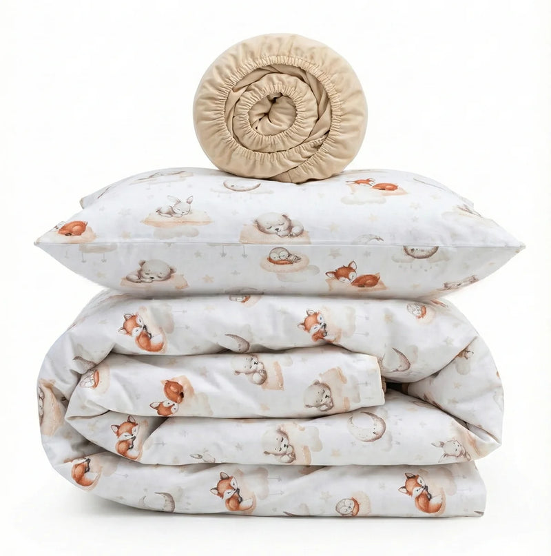 The Sleepy Fox Print Crib Bedding Set offers a premium feel and a charming, storybook-inspired design. This set beautifully pairs a playful print featuring sleeping foxes, bears, and bunnies with a warm, sandy beige solid fabric. Crafted from high-quality Poplin (100% Cotton), it provides exceptional breathability and a soft touch for your baby’s delicate skin. Poplin is a natural, durable material known for its smooth texture and long-lasting quality, maintaining its comfort and shape wash after wash. The adorable characters and calming neutral palette create a cozy, dream-like, and inviting sleeping environment for your little one.