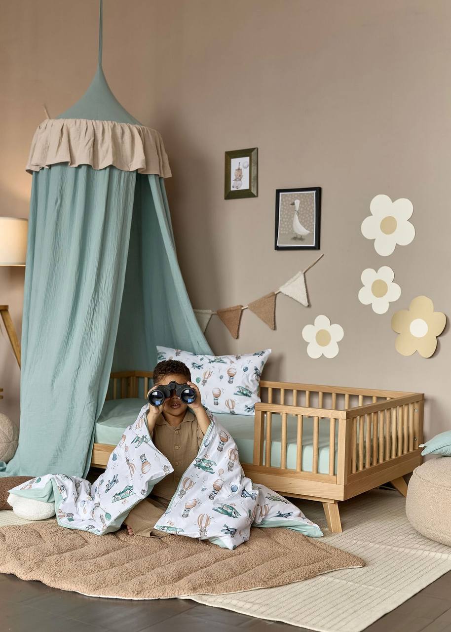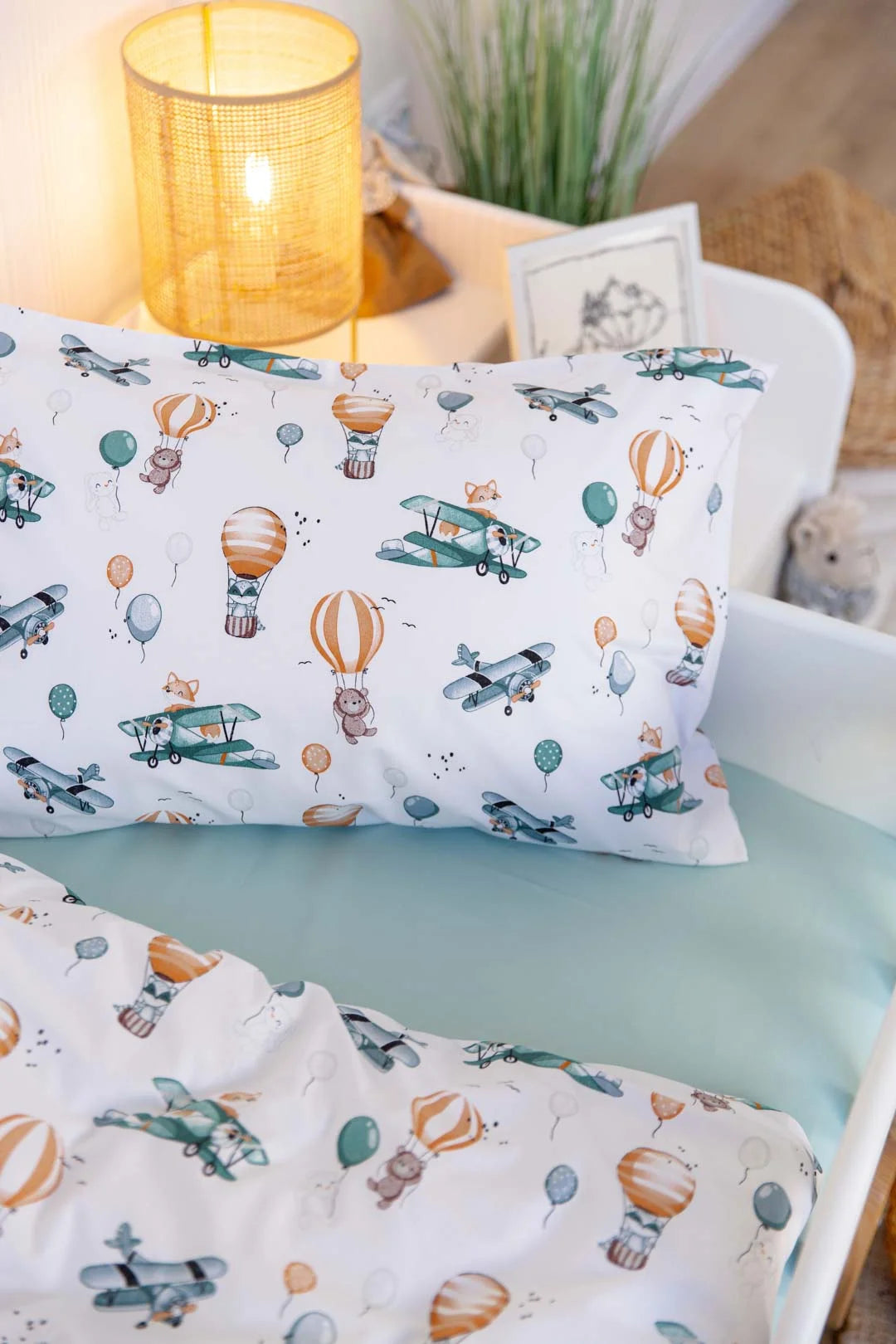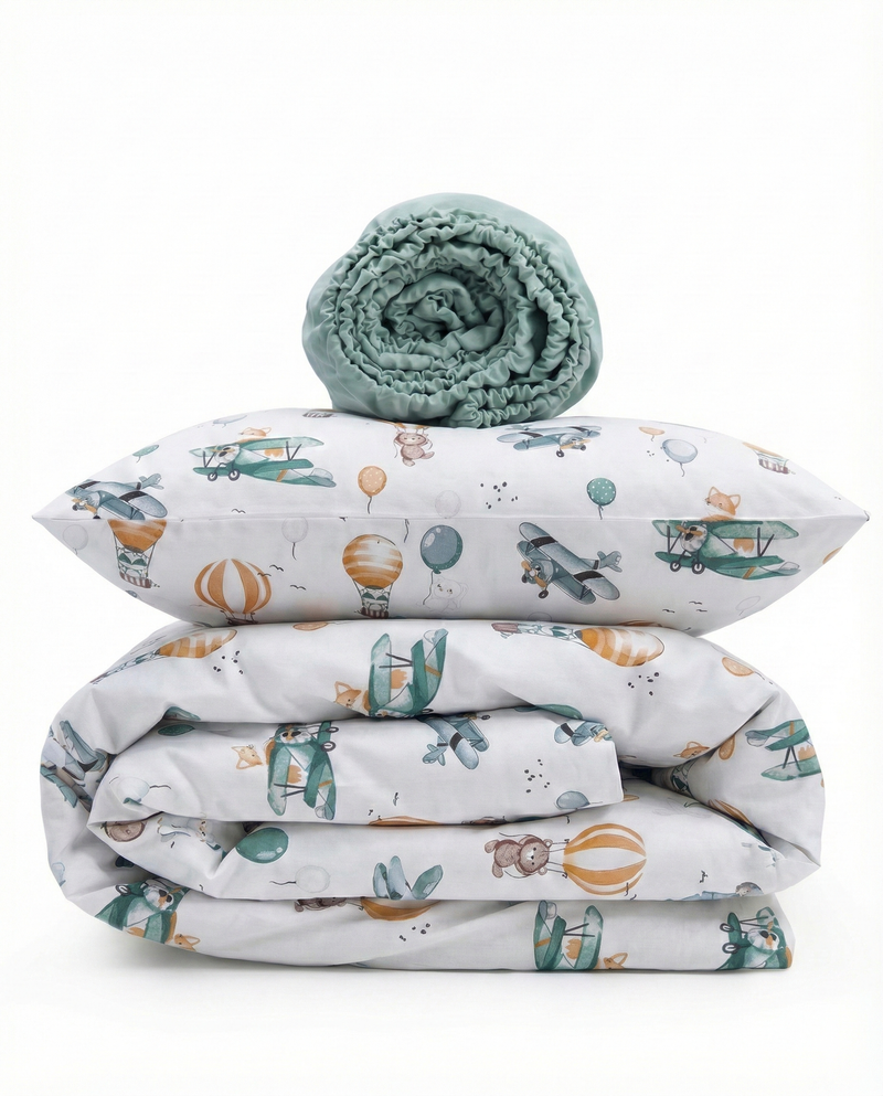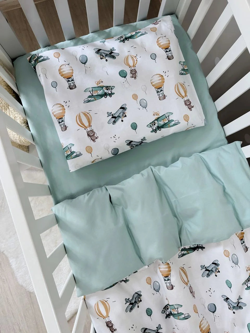 The Balloon Print Crib Bedding Set offers a soft, colourful, and comforting environment for your baby. This delightful set combines a whimsical hot air balloon print with solid-color poplin accents in a soft Dusty Mint shade, providing both visual interest and serenity. The components are made from Poplin (100% Cotton), a soft, durable, and densely woven fabric that is ideal for frequent washing and gentle on delicate skin.