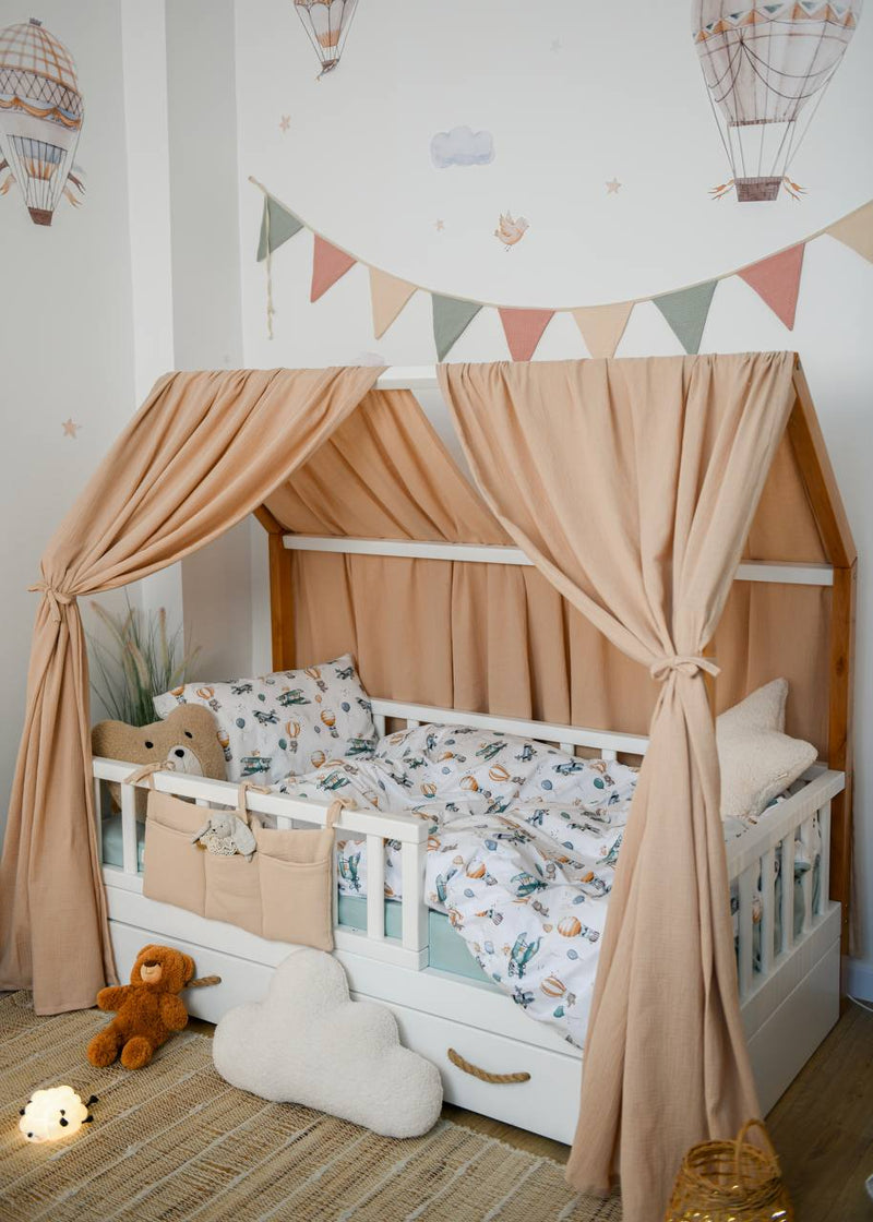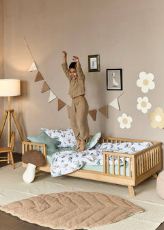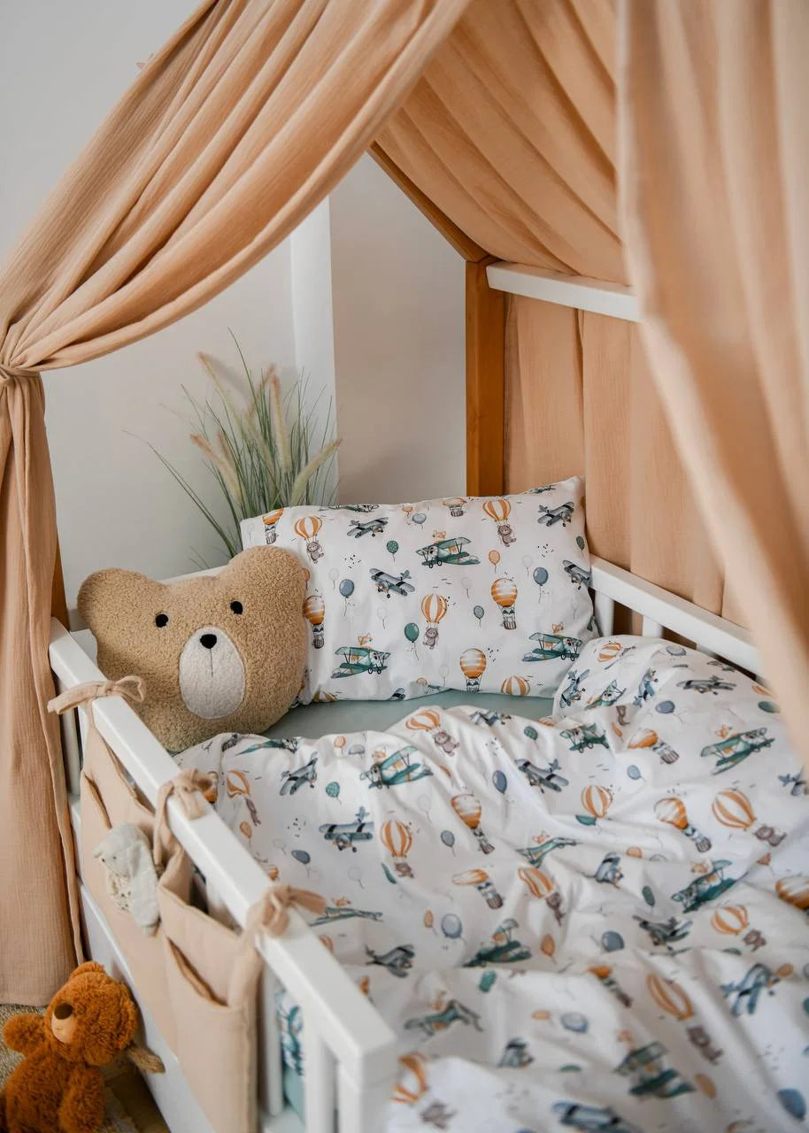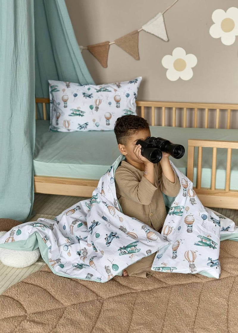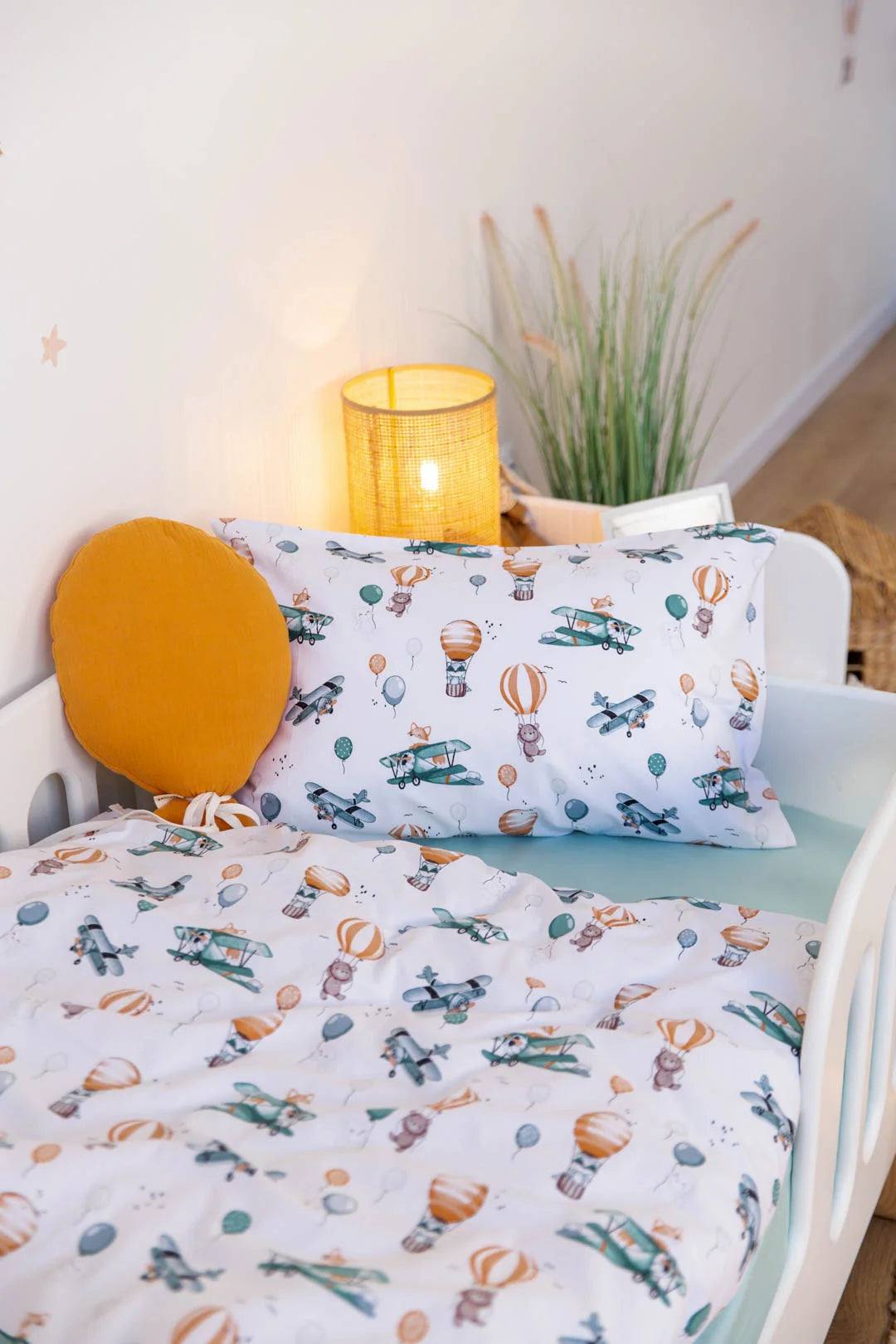 The Balloon Print Crib Bedding Set offers a soft, colourful, and comforting environment for your baby. This delightful set combines a whimsical hot air balloon print with solid-color poplin accents in a soft Dusty Mint shade, providing both visual interest and serenity. The components are made from Poplin (100% Cotton), a soft, durable, and densely woven fabric that is ideal for frequent washing and gentle on delicate skin.