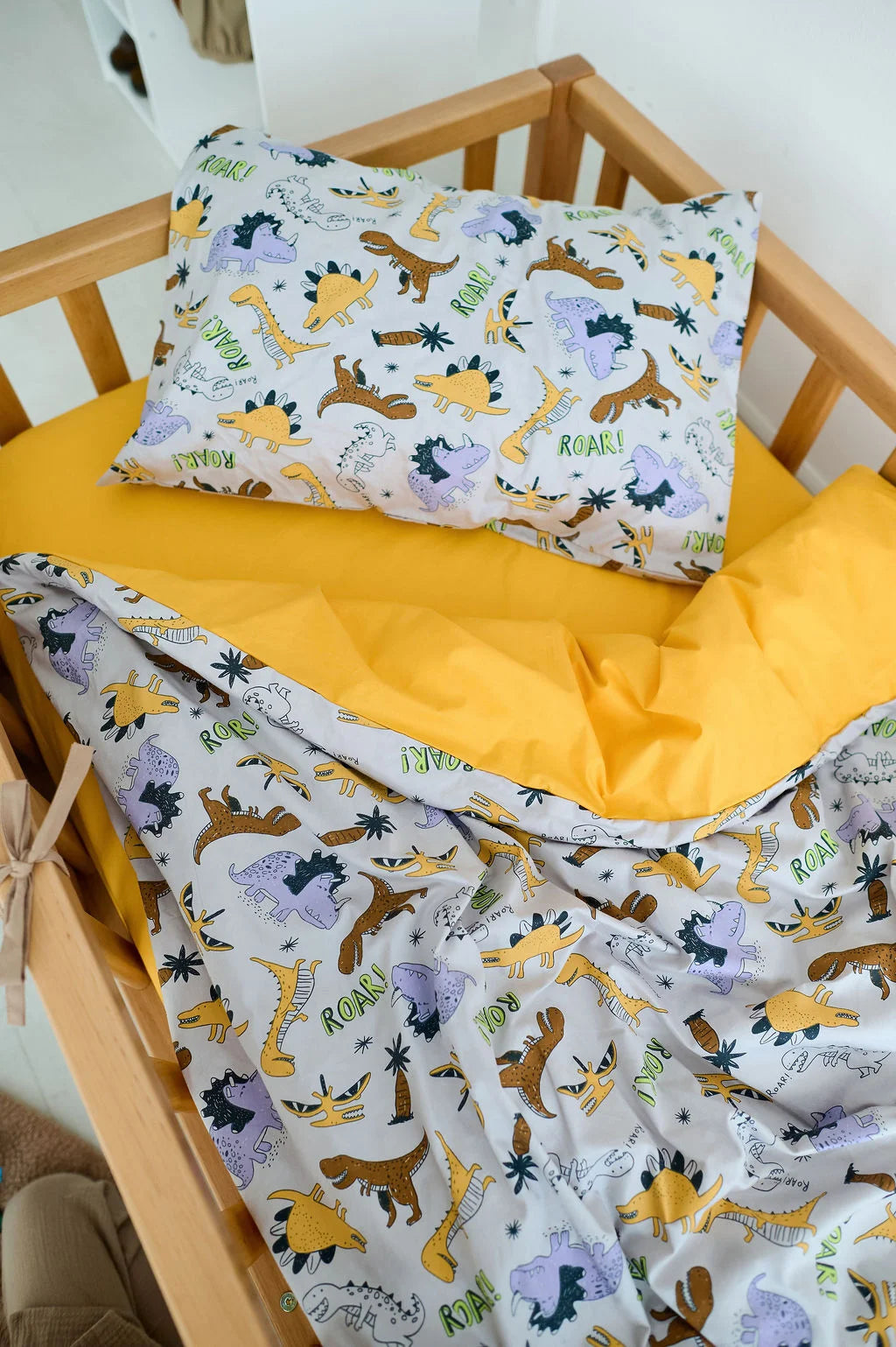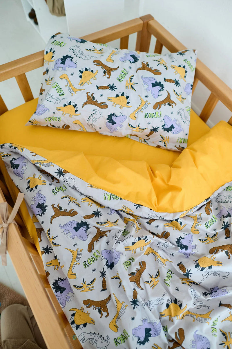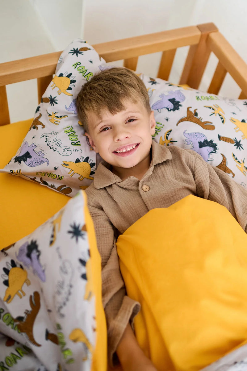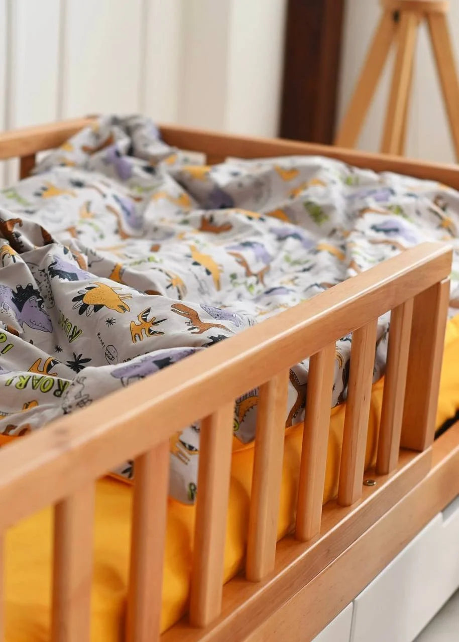 The Roar Print Crib Bedding Set offers a high-quality feel and a playful, dinosaur-themed design. This set cleverly combines premium Satin (100% Cotton) (for the detailed "Roar" print) and high-quality Poplin (100% Cotton) (for the solid part) in a vibrant, sun-drenched orange-yellow shade. Satin is a natural, silky-soft fabric known for its smooth finish and subtle sheen, while Poplin provides a lightweight, breathable feel with a soft, matte texture. Both are exceptionally durable materials that maintain their premium quality and softness even after 300+ washes. The friendly dinosaur characters and energetic color palette create a fun, comfortable, and inviting sleeping environment for your little explorer.