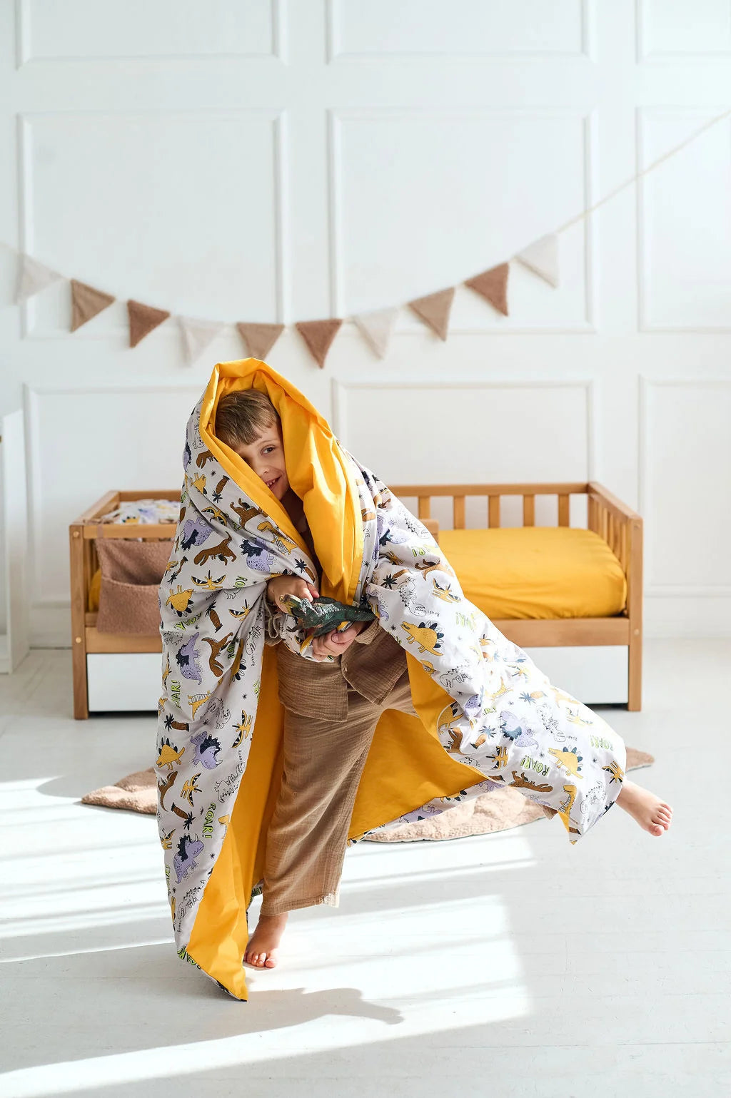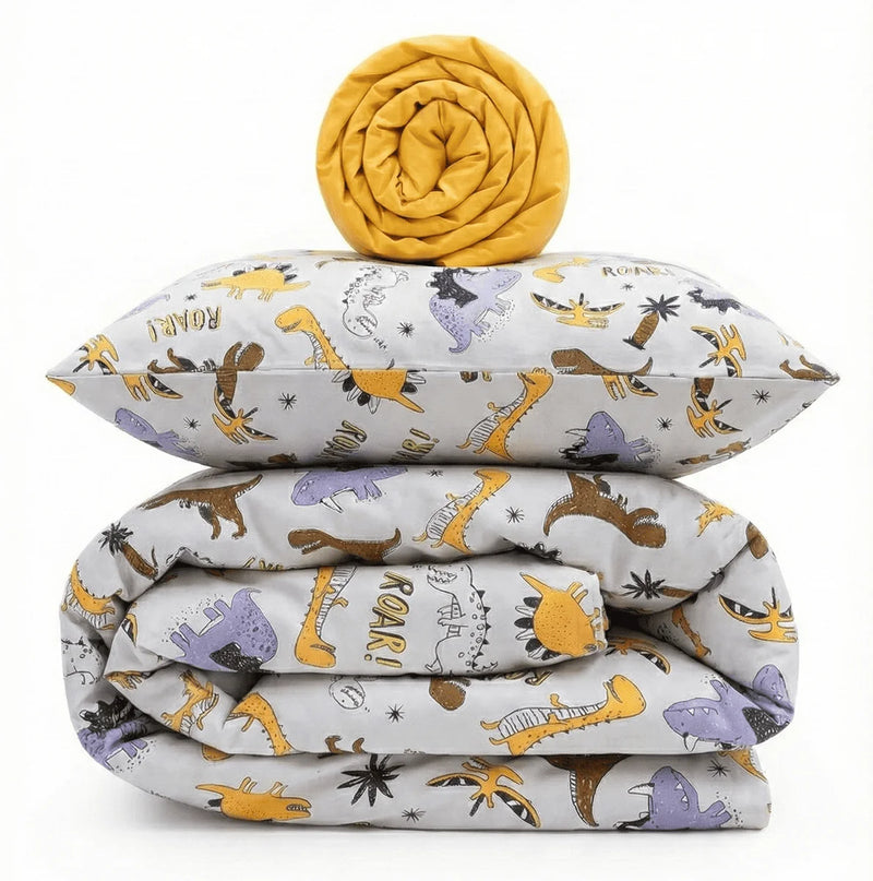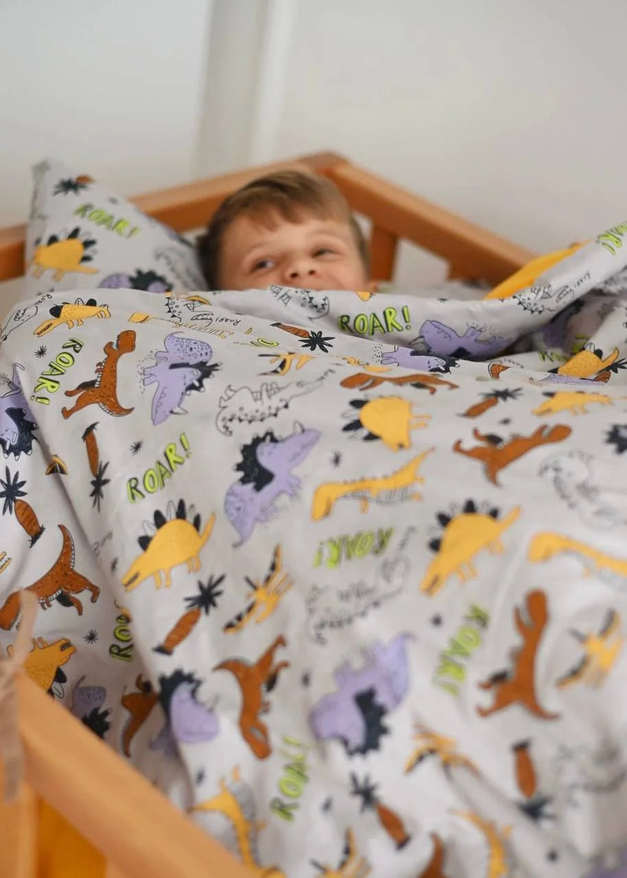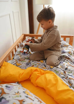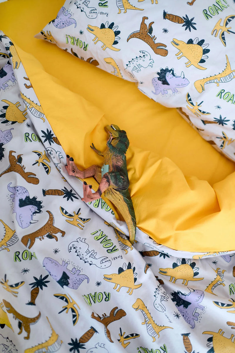 The Roar Print Crib Bedding Set offers a high-quality feel and a playful, dinosaur-themed design. This set cleverly combines premium Satin (100% Cotton) (for the detailed "Roar" print) and high-quality Poplin (100% Cotton) (for the solid part) in a vibrant, sun-drenched orange-yellow shade. Satin is a natural, silky-soft fabric known for its smooth finish and subtle sheen, while Poplin provides a lightweight, breathable feel with a soft, matte texture. Both are exceptionally durable materials that maintain their premium quality and softness even after 300+ washes. The friendly dinosaur characters and energetic color palette create a fun, comfortable, and inviting sleeping environment for your little explorer.